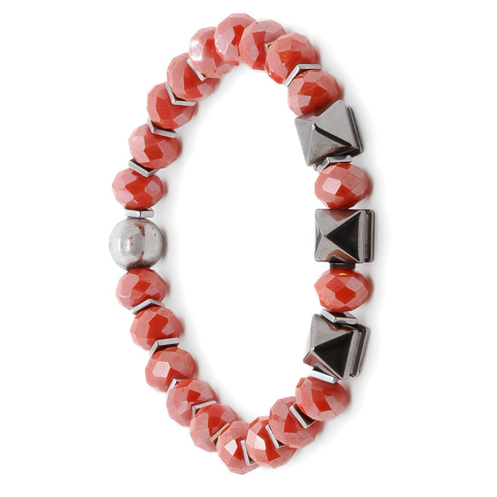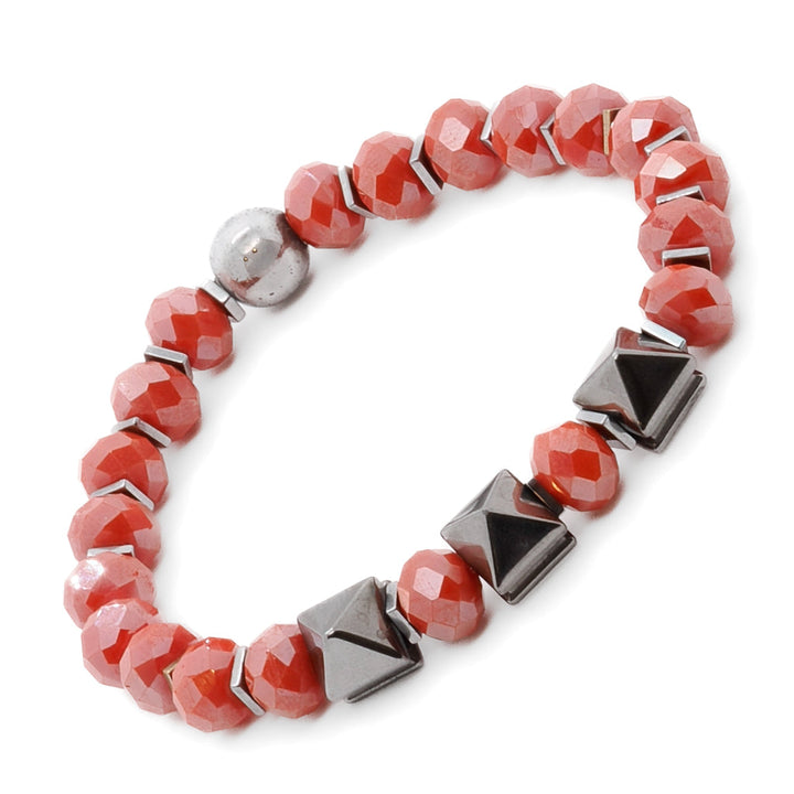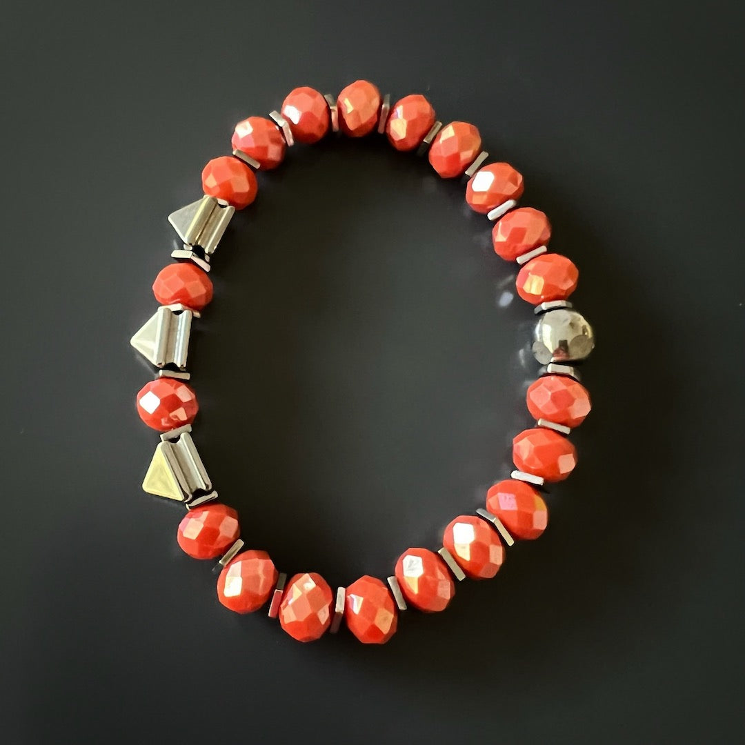 Made with orange crystal beads, silver hematite stone beads, and spacers on a high-quality stretchy jewelry cord. The bracelet size is 6.5 inches.
