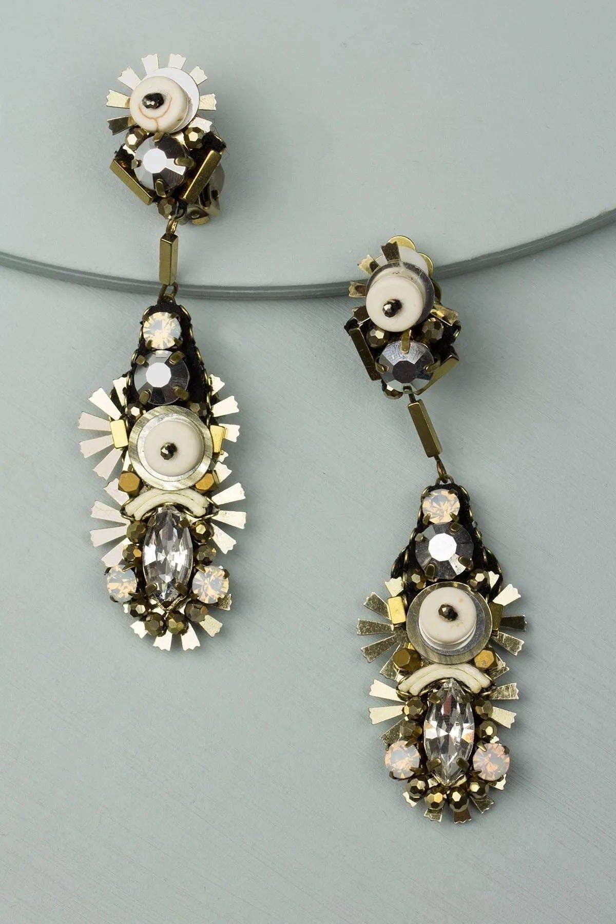 These Trudy Dangle Earrings by Saachi are an eclectic and unique accessory. These whimsical clip-on earrings feature an acetate and crystal design that is sure to stand out. They are a head-turning statement piece that adds a touch of bold glamour to any look.