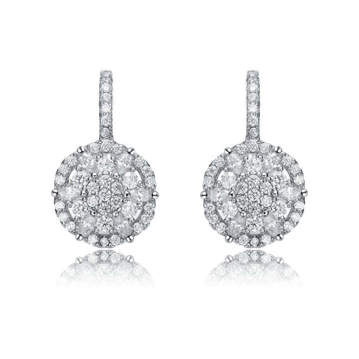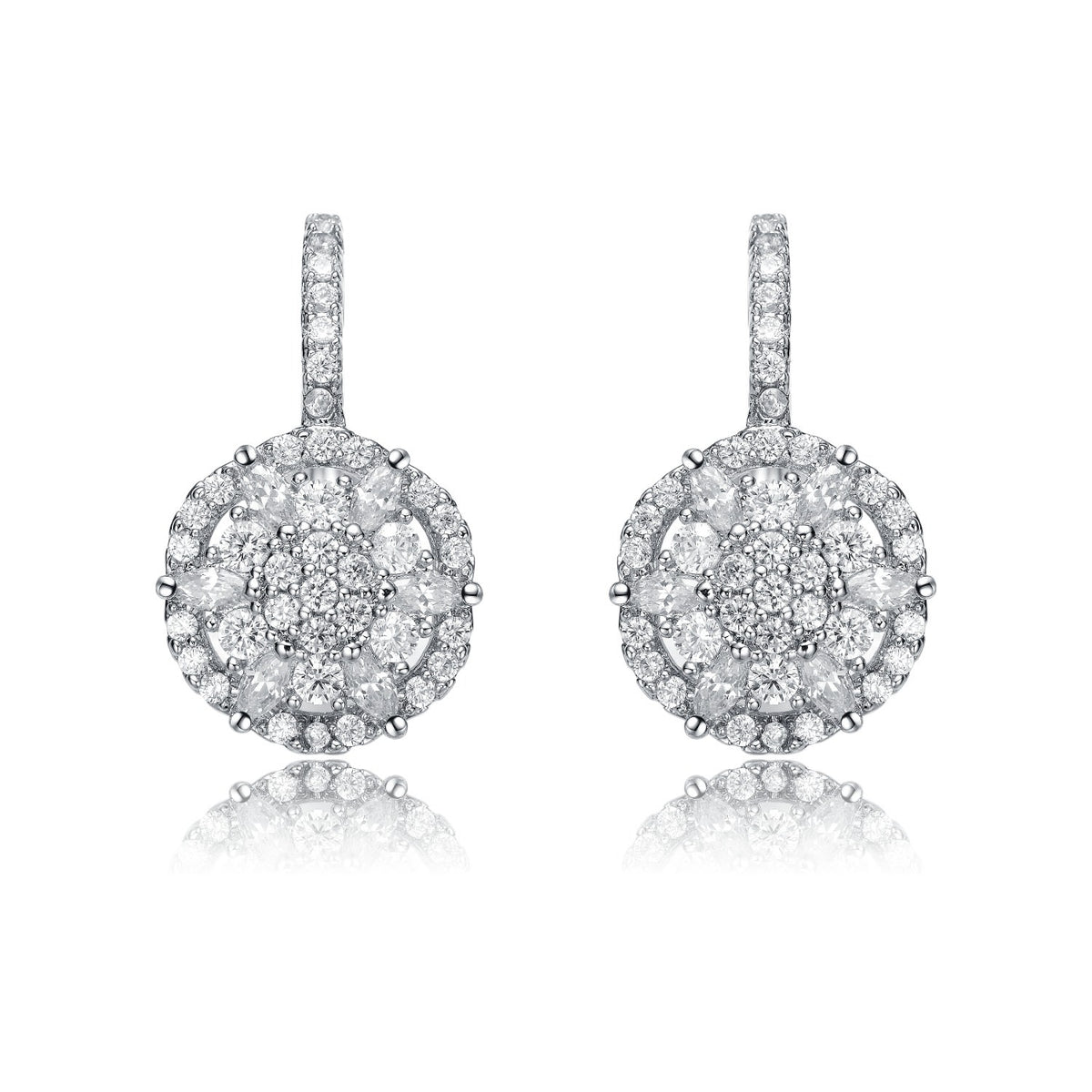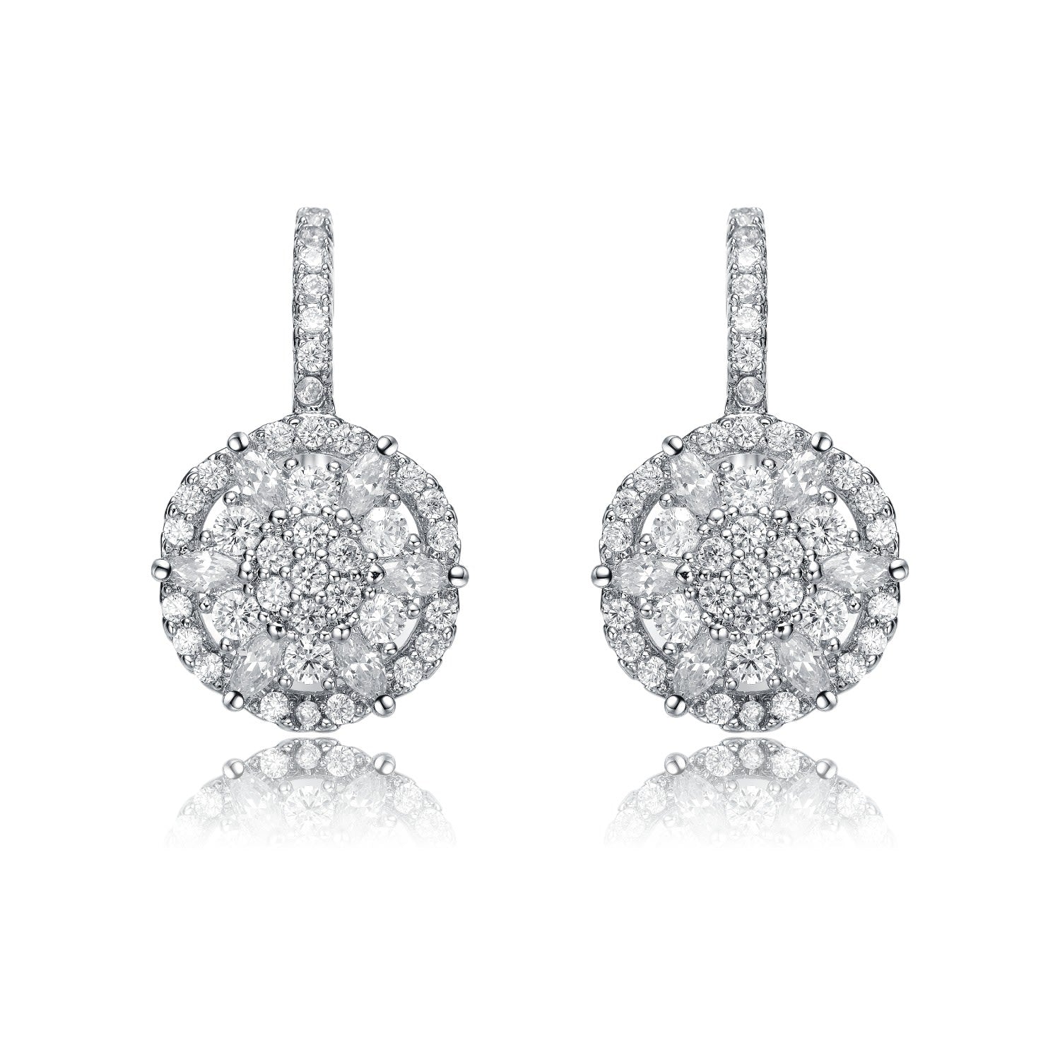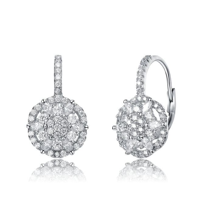 White Gold Plated With Clear Cubic Zirconia Flower Cluster Halo Leverback Dangle Earrings
