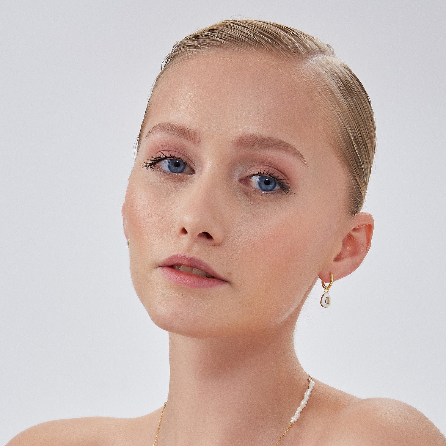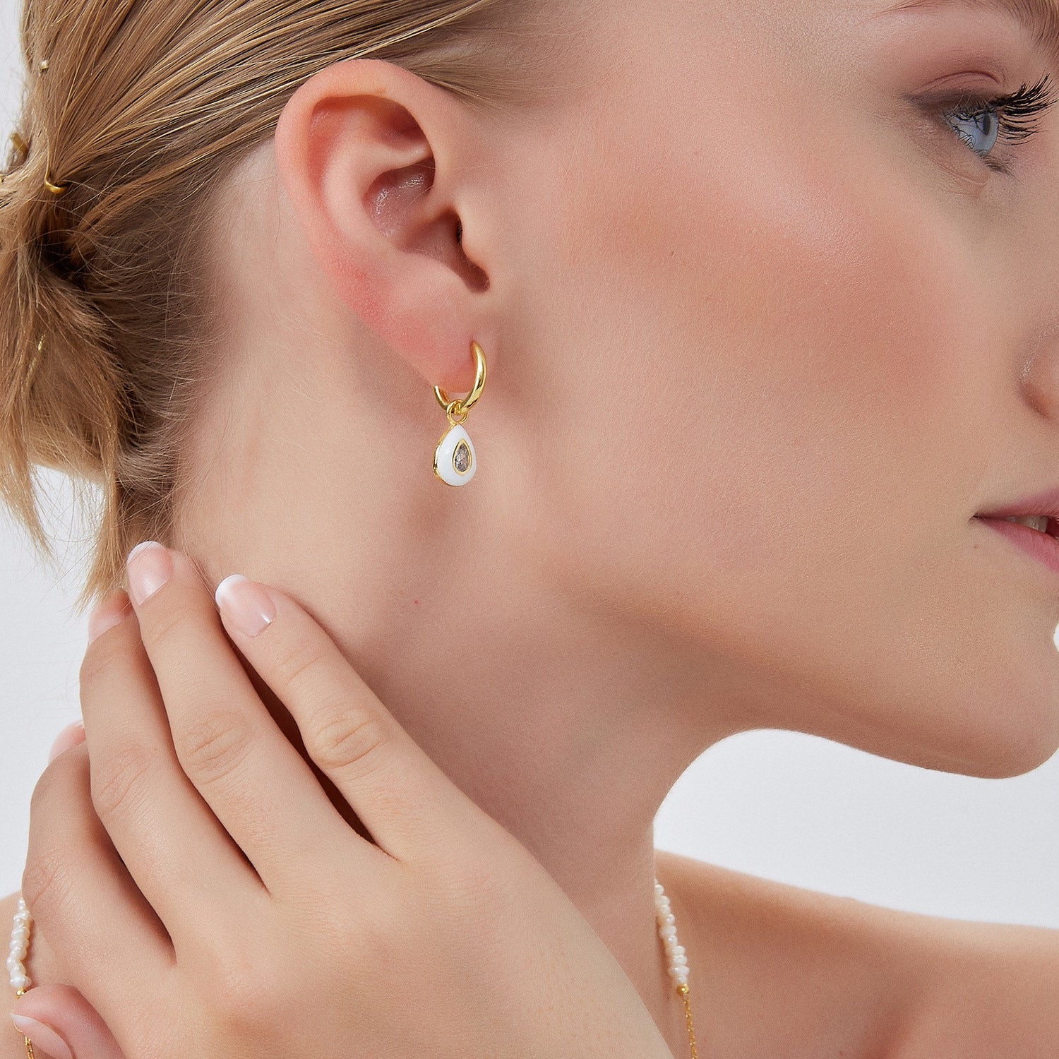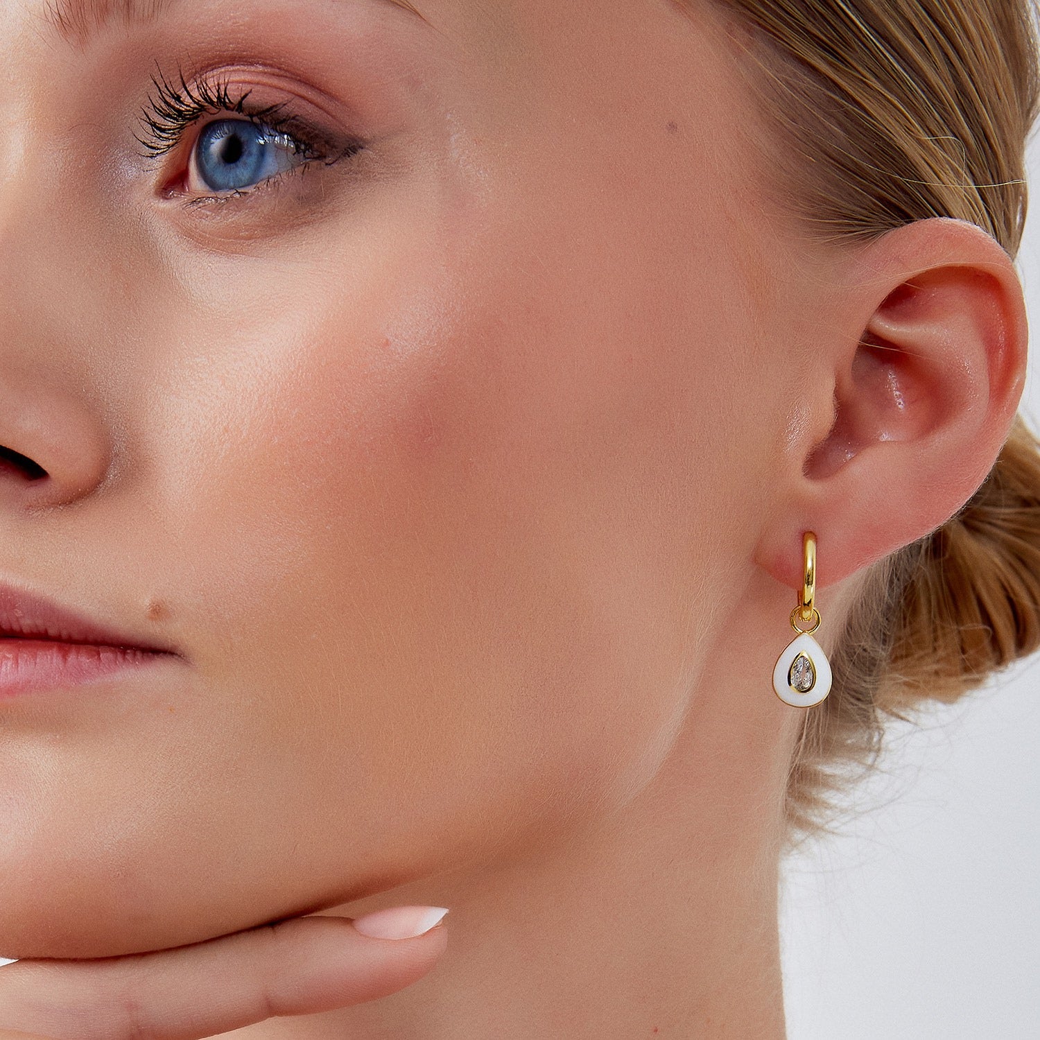 These earrings are crafted from 925 recycled sterling silver. They feature a huggie hoop design with a teardrop dangle embellished with a crystal and a subtle enamel finish. They have a hinged-back closure.