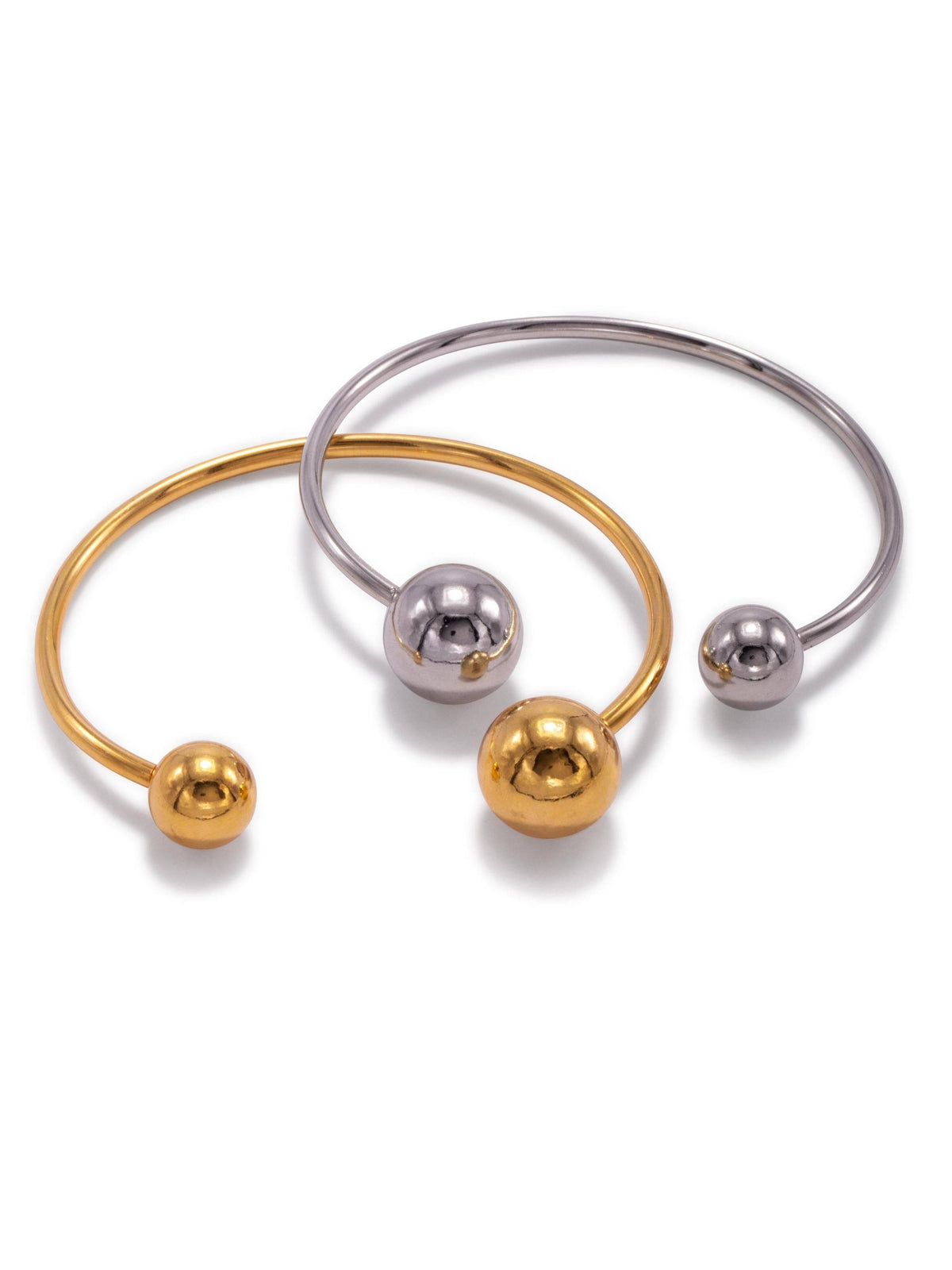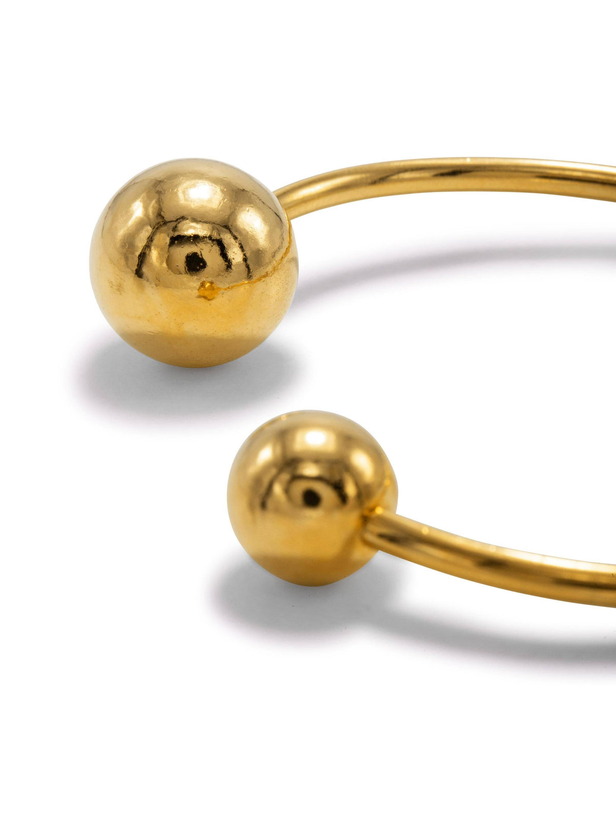 This Gold Orbita Bracelet by Jaredjamin is a graceful accessory designed to add a modern and elegant touch to any ensemble. The luxuriously smooth, textured gold orbs are crafted to catch and reflect light with every movement, creating a mesmerizing effect. Its distinct squeeze-to-fit design makes it comfortable and effortless to wear. This piece embodies a playful yet sophisticated vibe, perfect for any occasion where you want to add a subtle hint of refined luxury to your style.