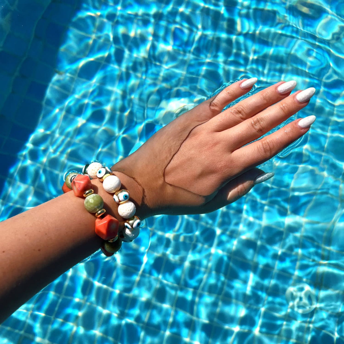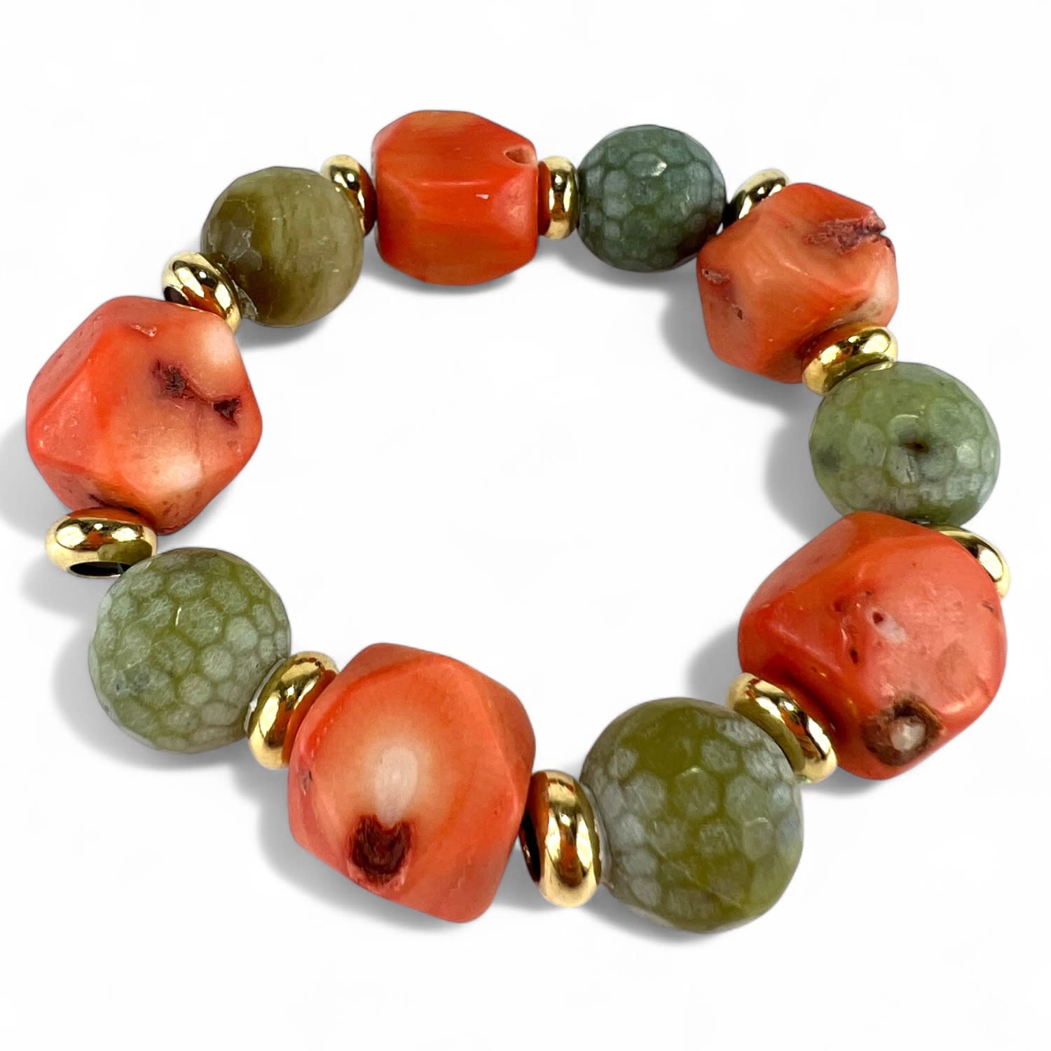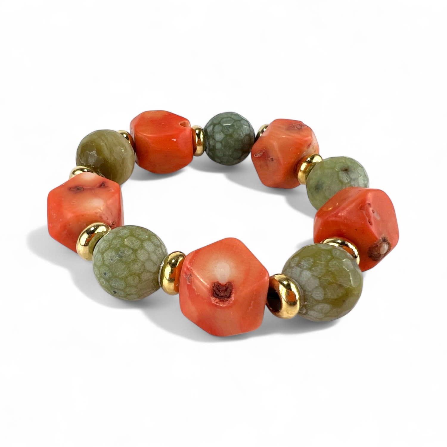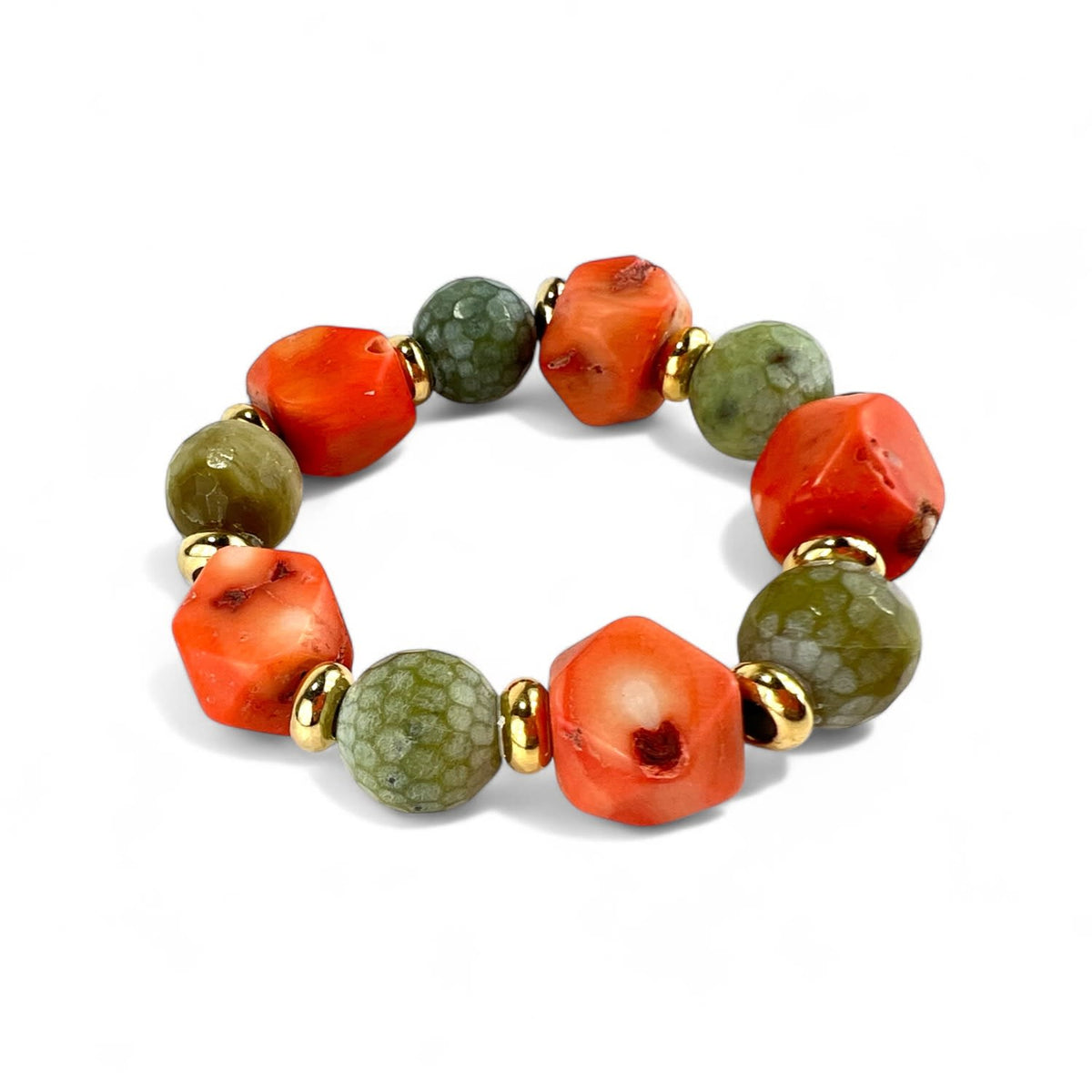 This limited-edition bracelet is handcrafted using natural coral and jasper stones with gold-plated brass. Due to the use of natural materials, variations in color and shape may occur.