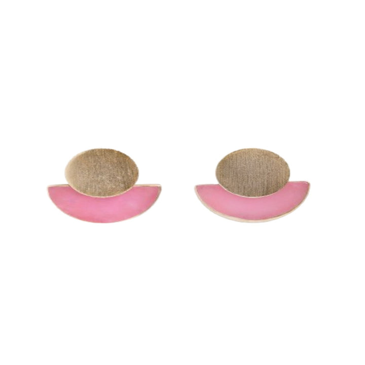 These post earrings feature a pink gemstone, an agate textured circular orb, and a half-moon shape.