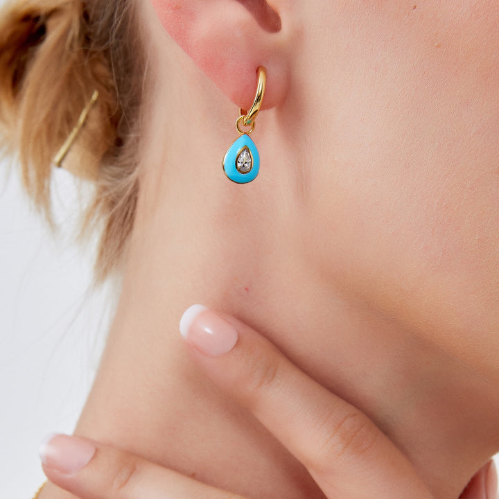 These earrings are crafted from 925 recycled sterling silver. They feature a huggie hoop design with a teardrop dangle embellished with a crystal and a subtle enamel finish. They have a hinged-back closure.