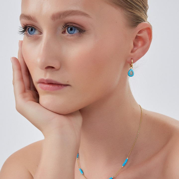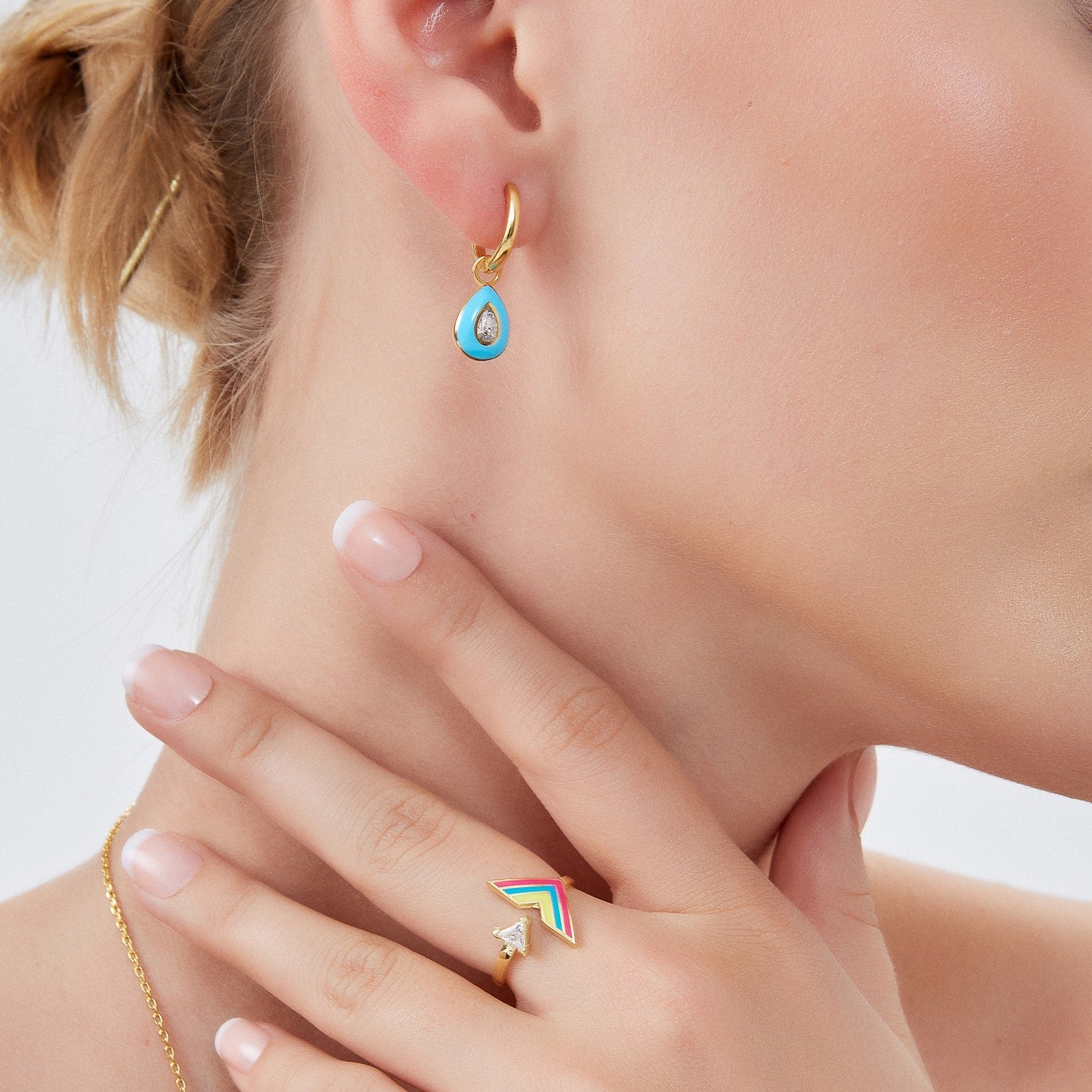 These Enamelled Jewelled Sterling Silver Drop Hoop Earrings by Spero London are trendy and playful, yet they give you a classy elegance. Created in 925 recycled sterling silver, they feature a huggie hoop design with a teardrop dangle embellished with a glistening crystal and a subtle enamel finish. The hinged-back closure ensures a secure and comfortable fit, and they come in white, blue, and light blue.