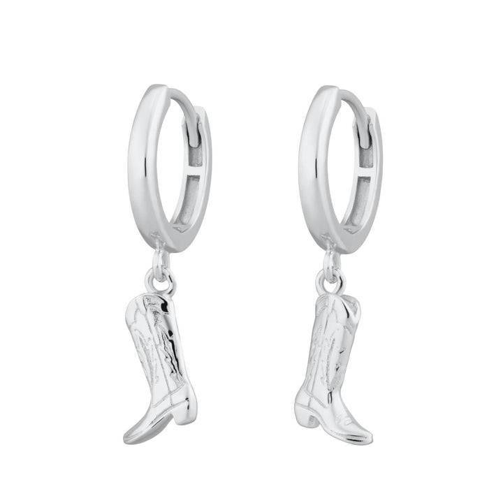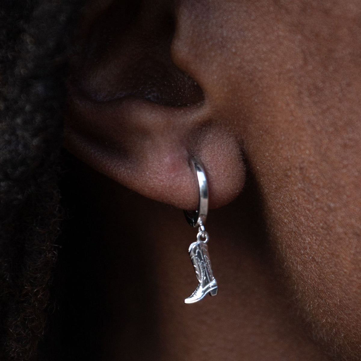 Recycled sterling silver with rhodium plating. Cowboy boot charm hoop earrings.