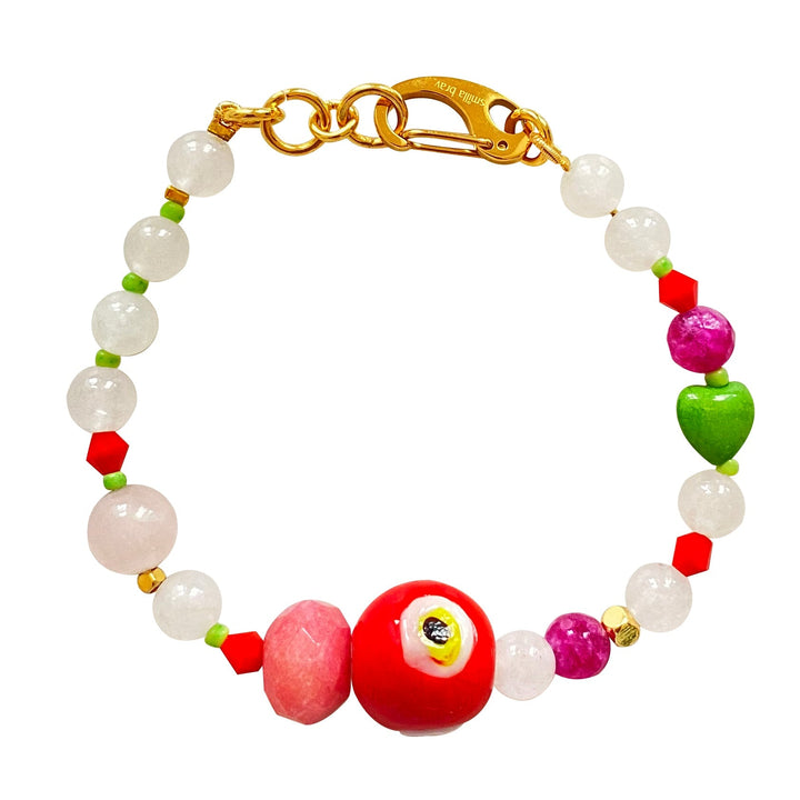 This handmade bracelet features a bold red evil eye bead, vibrant faceted and heart-shaped gemstones in pink, green, and white, and a gold-plated clasp.