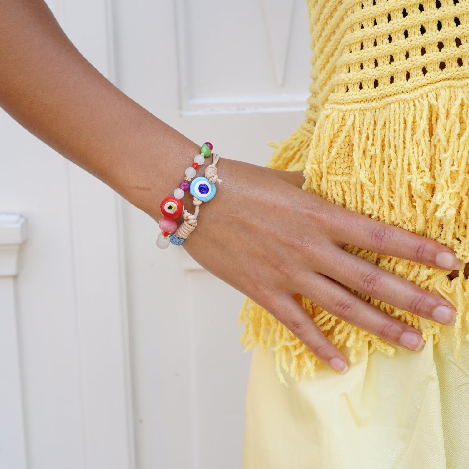 This Evil Eye Bracelet Bonjuk by Smilla Brav is your new lucky charm, bursting with playful energy and spiritual symbolism. This handmade bracelet features a bold red evil eye bead for protection, along with vibrant heart-shaped and faceted gemstones in pink, green, and white. The unique blend of charm bracelet and spiritual talisman makes it a standout piece for anyone who loves color and wishes to attract joy. It's perfect for gifting or for brightening up your everyday stack with a meaningful touch.