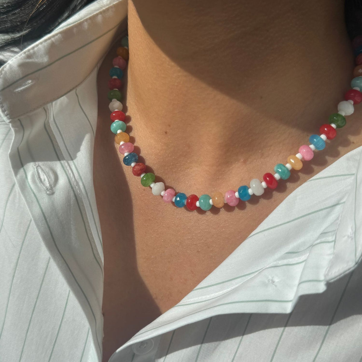 This necklace is strung with a mix of vibrant crystal beads and is finished with a gold clasp. The specific materials of the clasp are not listed.