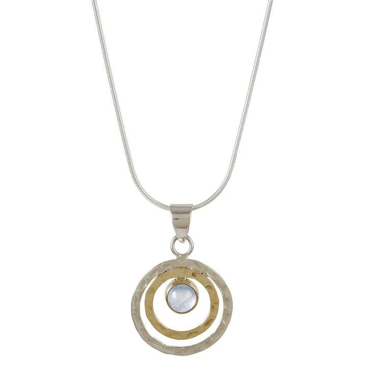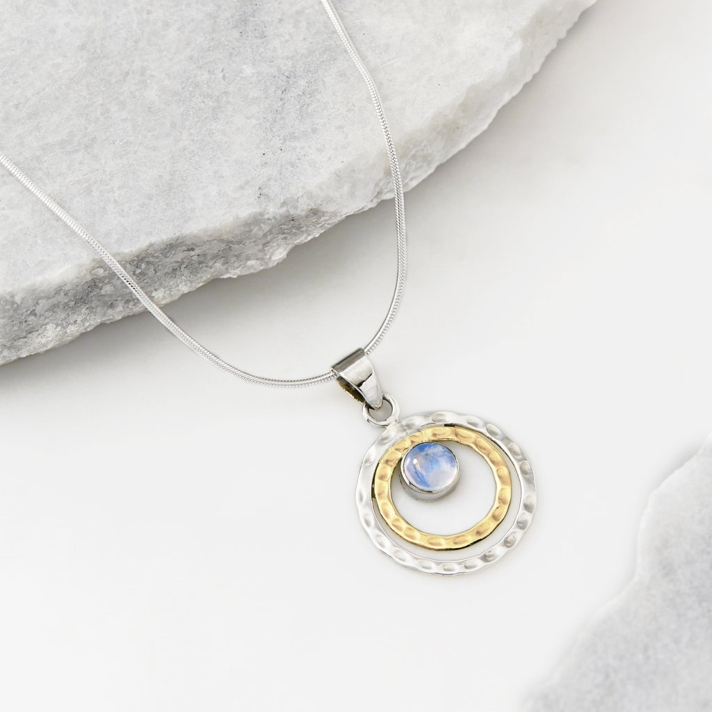 Handmade in sterling silver with moonstone gemstone (0.6cm). Pendant suspended on a sterling silver snake chain.