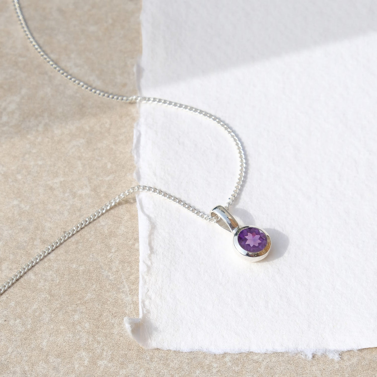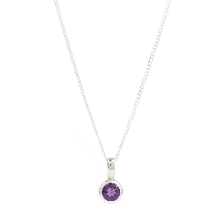 Sterling silver pendant necklace set with faceted amethyst gemstone (6mm). Handmade. Also available in gold vermeil.