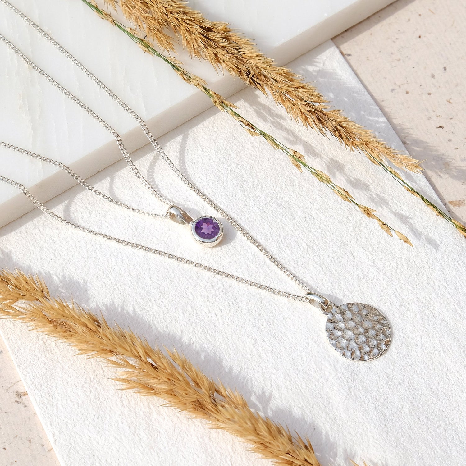 This February Birthstone Charm Silver Necklace - Amethyst by Charlotte's Web Jewellery glows with regal hues of purple, from deep violet to delicate lilac. Set in sterling silver, the amethyst—February’s birthstone—symbolises courage, clarity, and strengthened relationships. A personalised and meaningful piece, it is a thoughtful gift to honour a loved one or an empowering talisman for yourself.