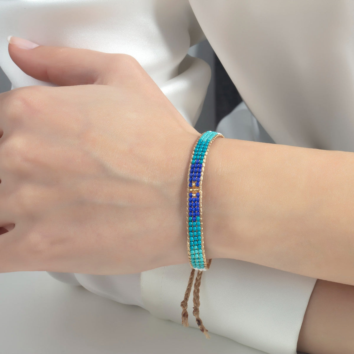 This bracelet is handwoven with tiny blue glass beads.