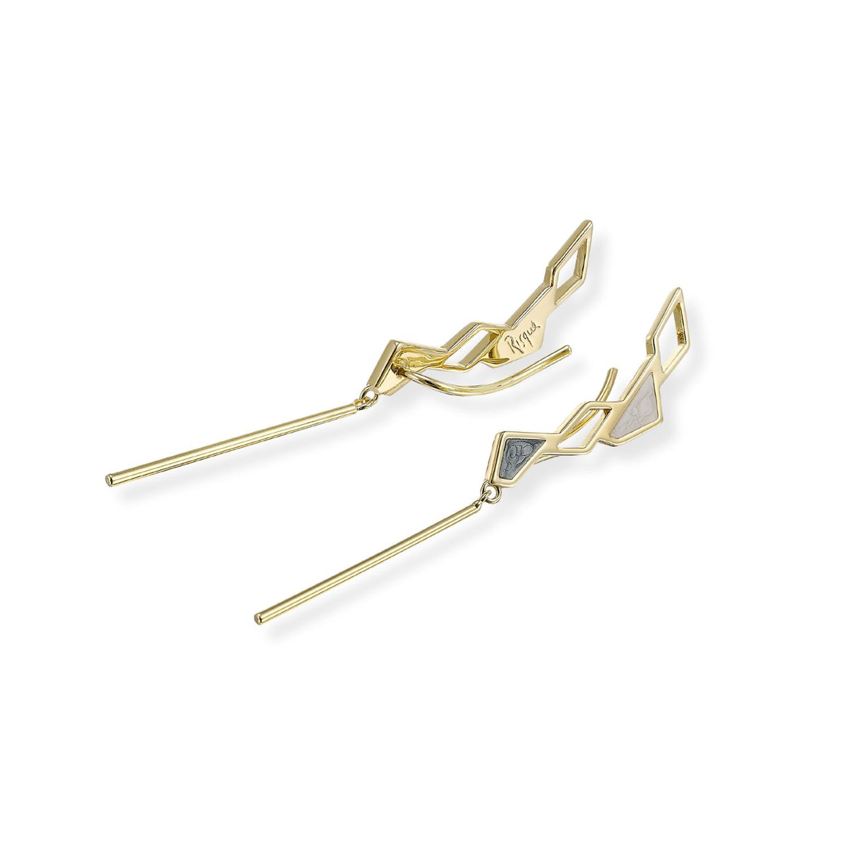 These earrings are made from 14ct gold-plated brass with grey and white enamel, epoxy, and mother of pearl dust accents. They weigh 5g per pair and measure 30mm x 8.5mm x 33mm.
