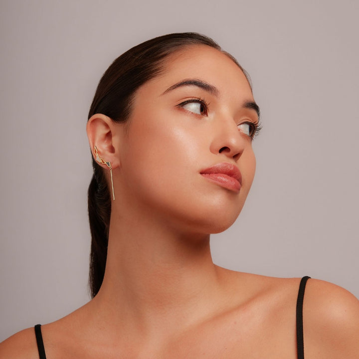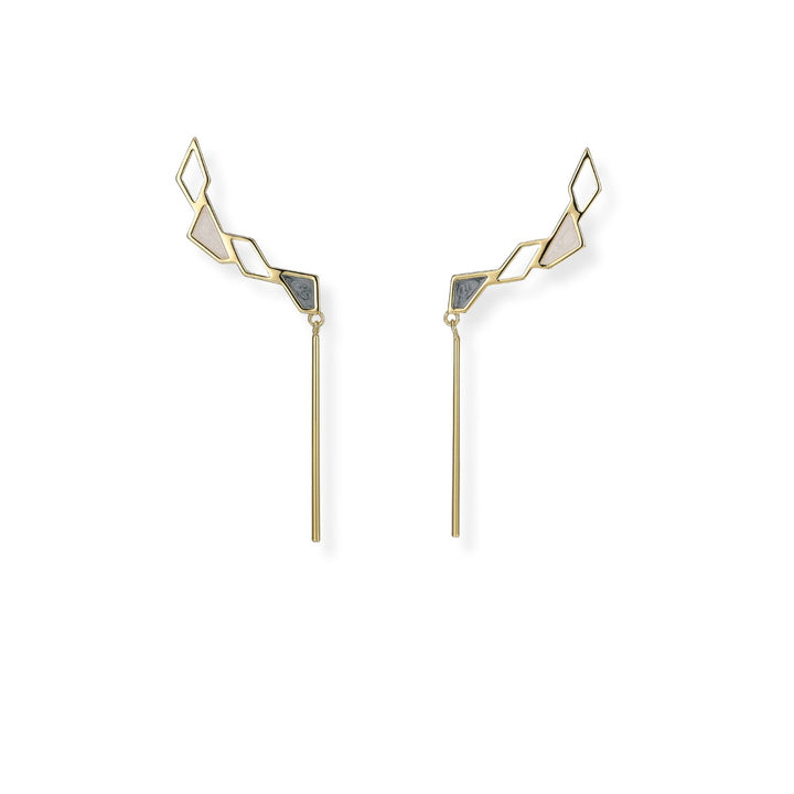 The Persefone Climber earrings by Risqué are a striking and unique accessory. They are meticulously crafted from four progressively patterned segments, creating a beautiful visual effect. Adorned with grey and white enamel, epoxy, and mother of pearl dust, these earrings also feature a thin bar that gracefully hangs from each climber, adding movement and dynamism. They are made of 14ct gold-plated brass.
