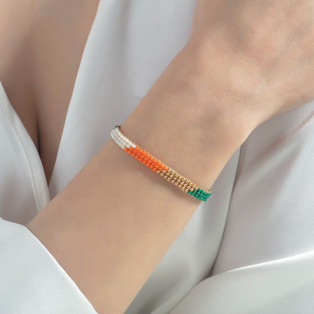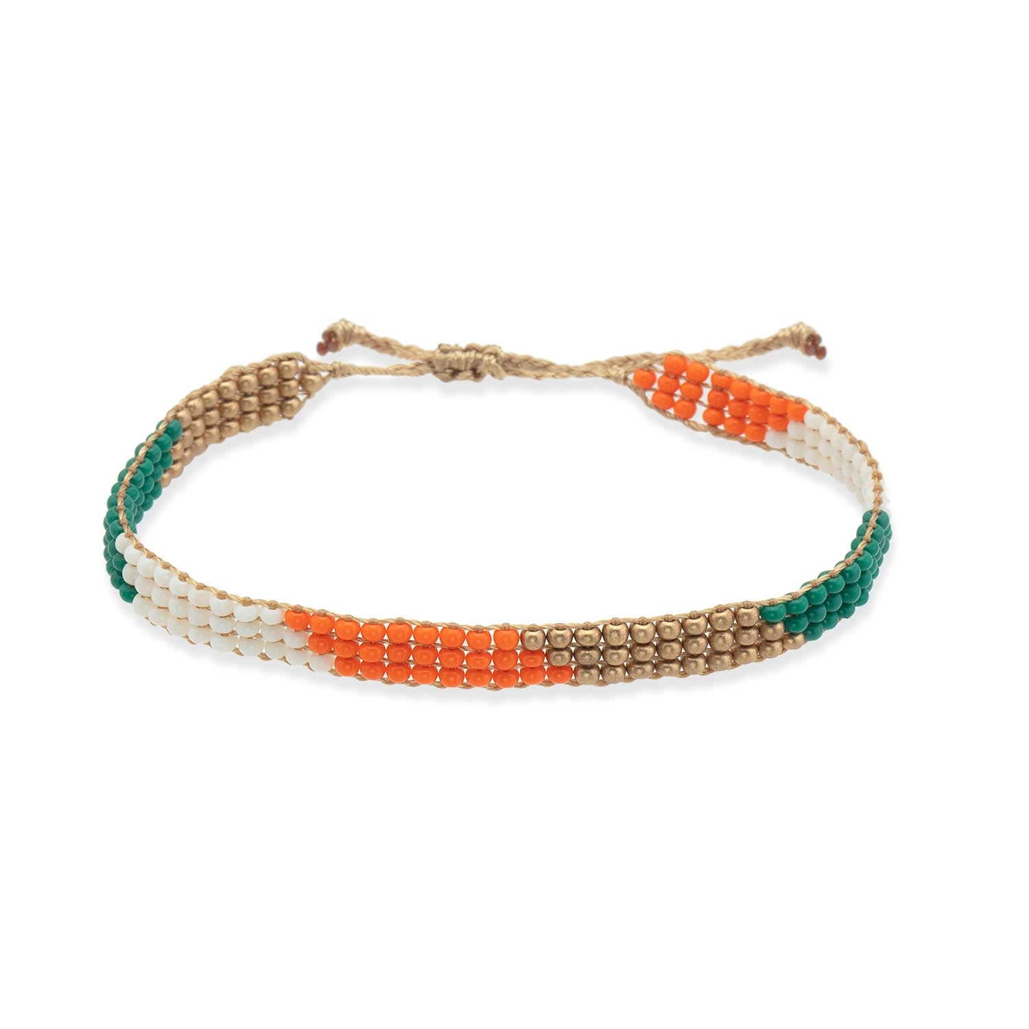 This bracelet is handwoven with tiny, multicolored glass beads.