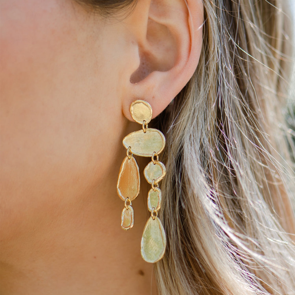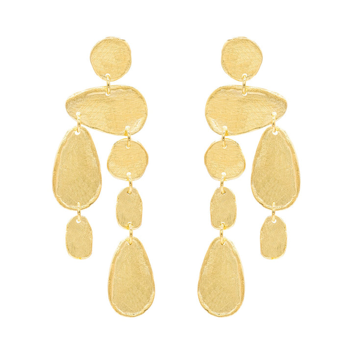 The Julane Earrings by Marcia Moran feature organic coin-shaped drops in 18k gold plate. Handmade in Brazil, their bold yet natural silhouette makes them versatile statement earrings.