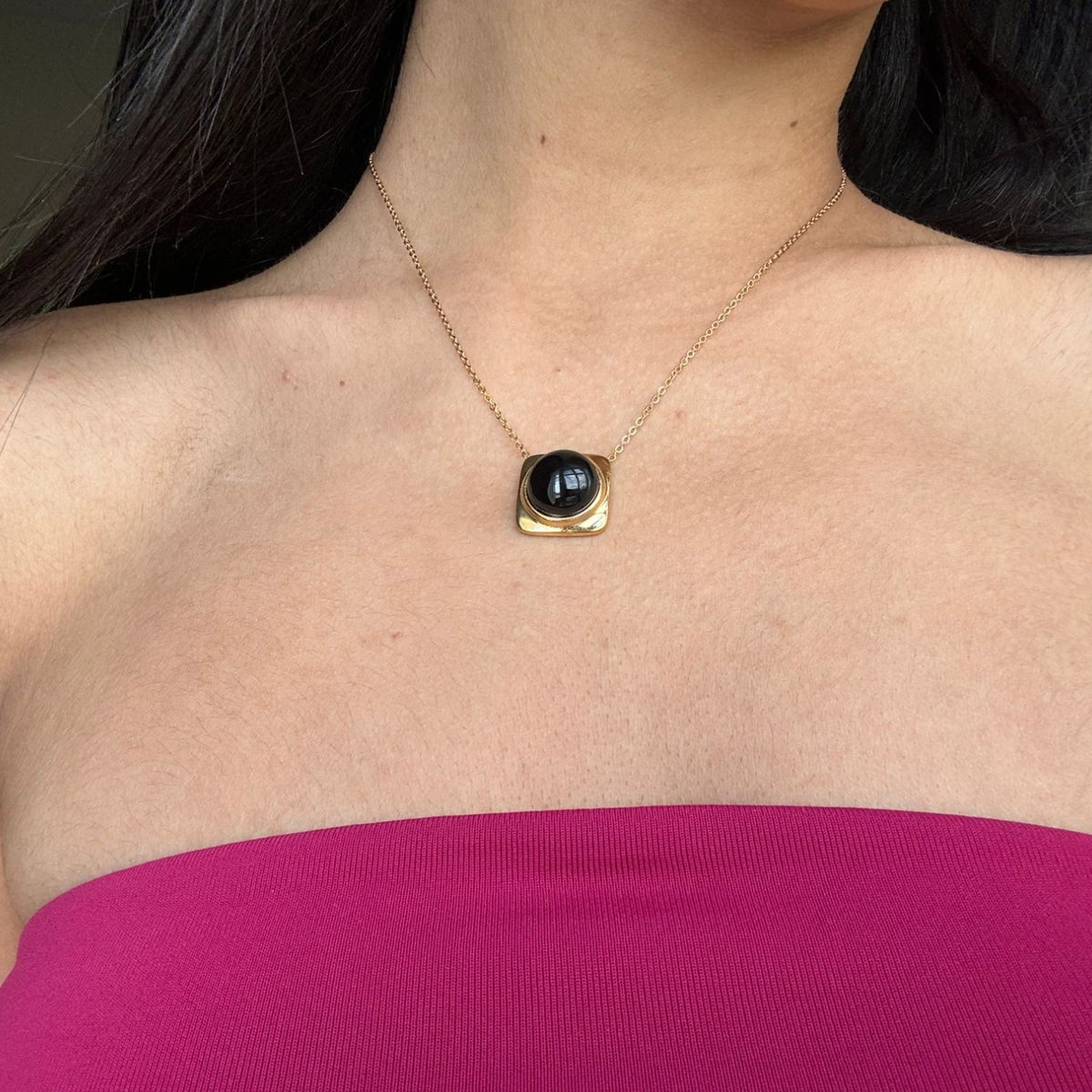 This necklace is made from a stainless steel base with a thick layer of high-quality 18k gold plating. It features an onyx stone pendant. It is waterproof, tarnish-free, and sweatproof.