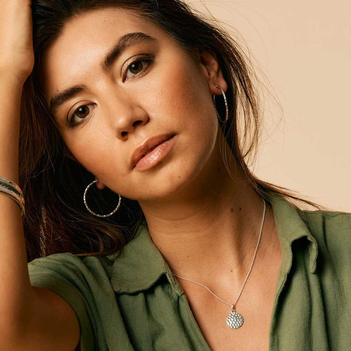 The Lakshmi Hammered Disc Silver Necklace by Charlotte's Web Jewellery is the epitome of grace and charm. Inspired by the Hindu goddess of wealth and prosperity, it features a hand-hammered sterling silver coin suspended on a classic silver chain. This piece is designed for daily wear and coordinates effortlessly with any outfit, whether for business, casual, or boho-chic looks. It’s a timeless and elegant accessory that adds a touch of sophistication.