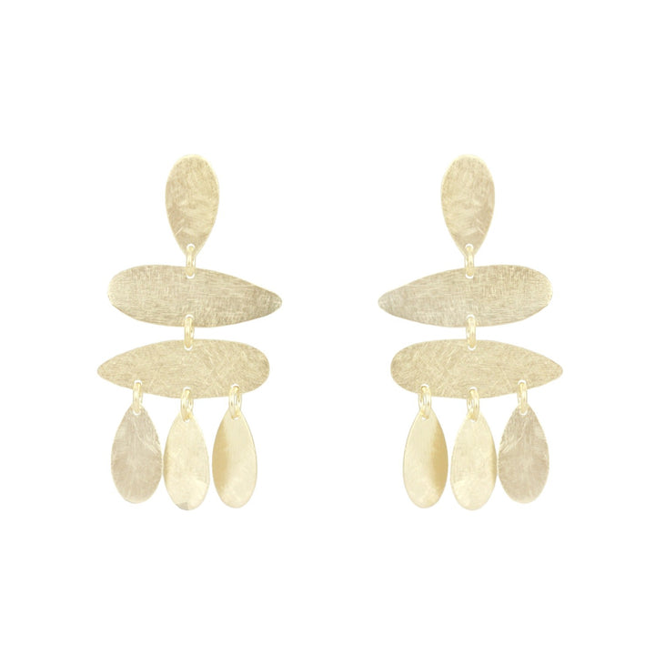 Handmade in Brazil, these earrings are crafted from precious and non-precious metals and plated in 18k gold. They feature an asymmetrical chandelier design with a brushed finish.