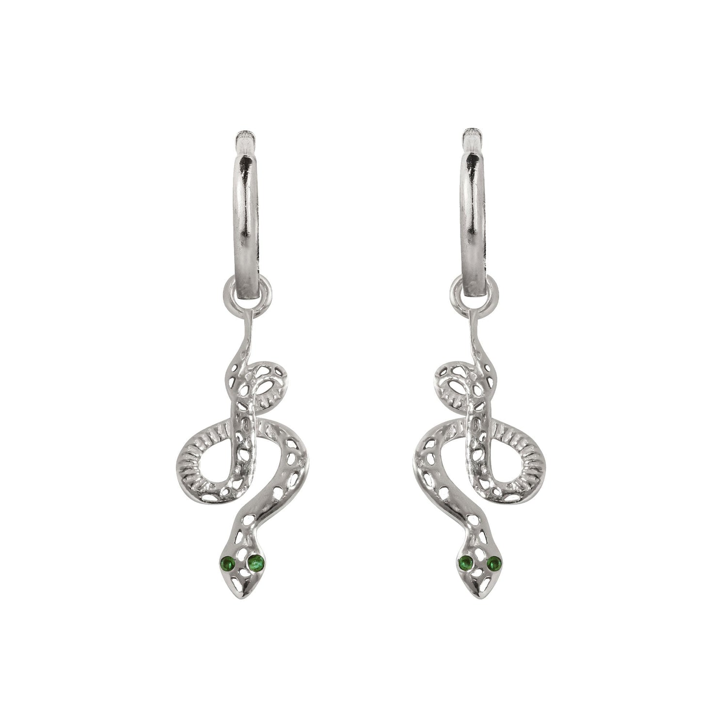 The Serpentina Sterling Silver Huggie Hoops by Charlotte's Web Jewellery are handcrafted from solid sterling silver. These unique snake hoop earrings feature striking emerald eyes that symbolize love, renewal, and healing. They are hypoallergenic and nickel-free, perfect for both everyday wear and as a statement piece.