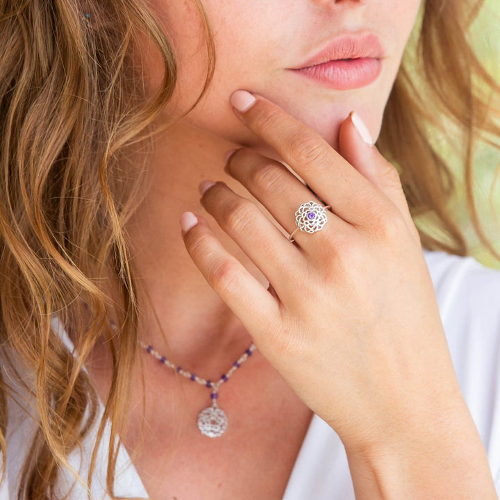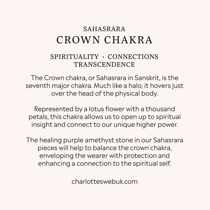 This Crown Chakra Silver Ring - Amethyst by Charlotte's Web Jewellery channels spiritual connection and enlightenment. Inspired by the lotus flower, it honours the Sahasrara chakra—the gateway to universal wisdom. With amethyst stones radiating calm and clarity, this ring is a spiritual talisman as well as an elegant design piece.