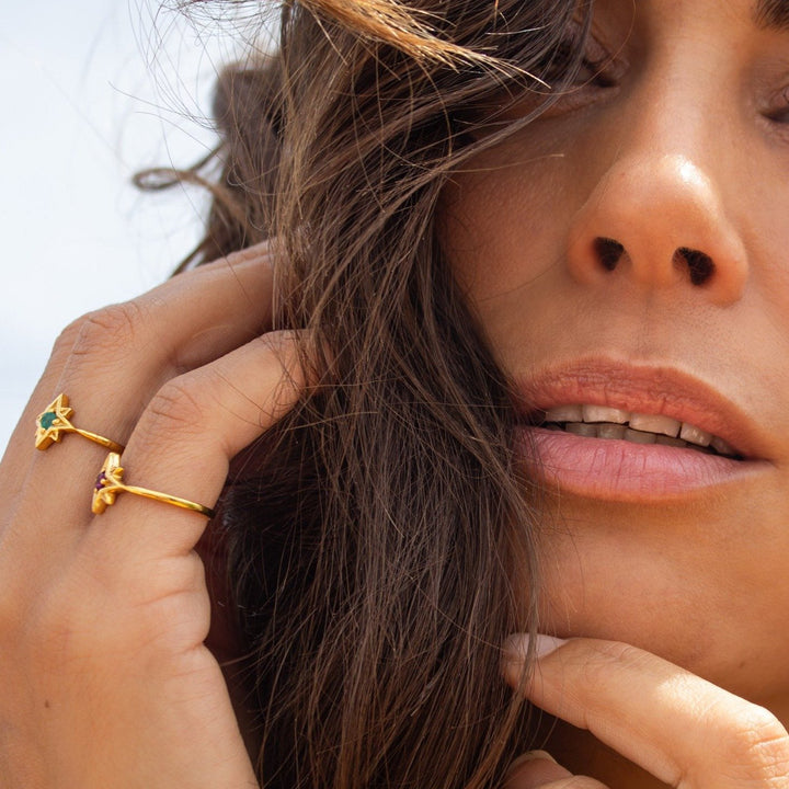 The Guiding North Star Gold Vermeil Ring by Charlotte's Web Jewellery is a mesmerizing stacking ring inspired by the North Star. It is set with a central sparkling Rhodolite Garnet, the January birthstone. This ring is designed to guide the wearer to peace and positivity, making it a perfect inspirational accessory. It is made from gold vermeil and is also available in sterling silver.