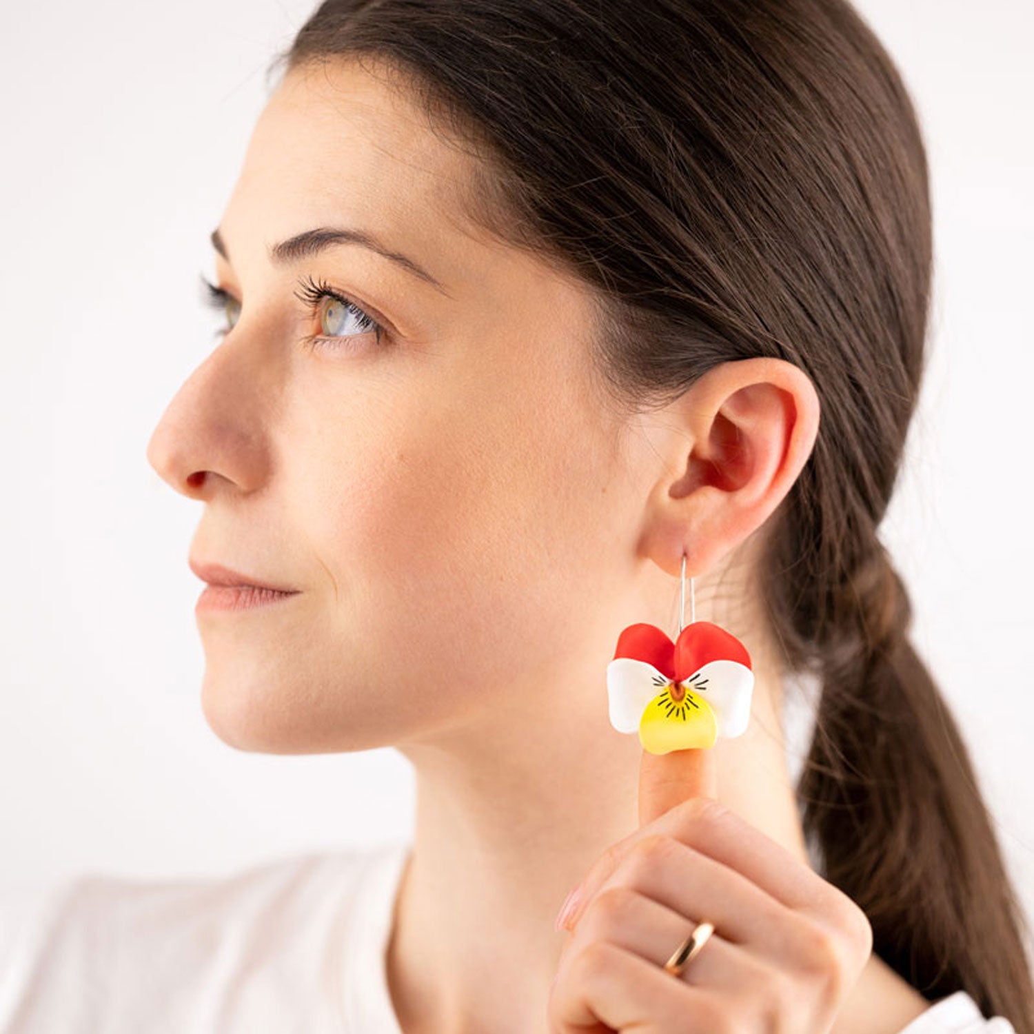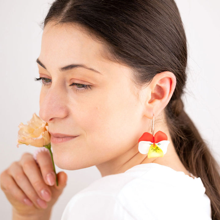 These Sterling Silver Red Pansy Flower Dangle Earrings by Oanasavu.creations are a whimsical and charming accessory, perfect for adding a touch of unique, handcrafted elegance to your style. Each delicate pansy petal is meticulously hand-shaped from lightweight professional jewelry clay, making them both comfortable and one-of-a-kind. They dangle from recycled 925 Sterling Silver ear wires, ensuring a secure and skin-friendly fit. These earrings are a testament to artisanal creativity and are ideal for someone who appreciates the beauty of handcrafted, unique pieces.