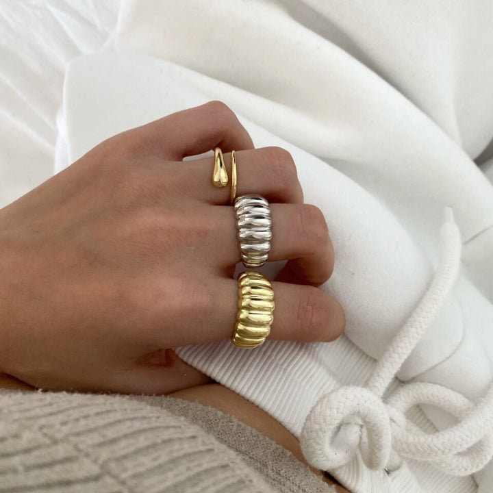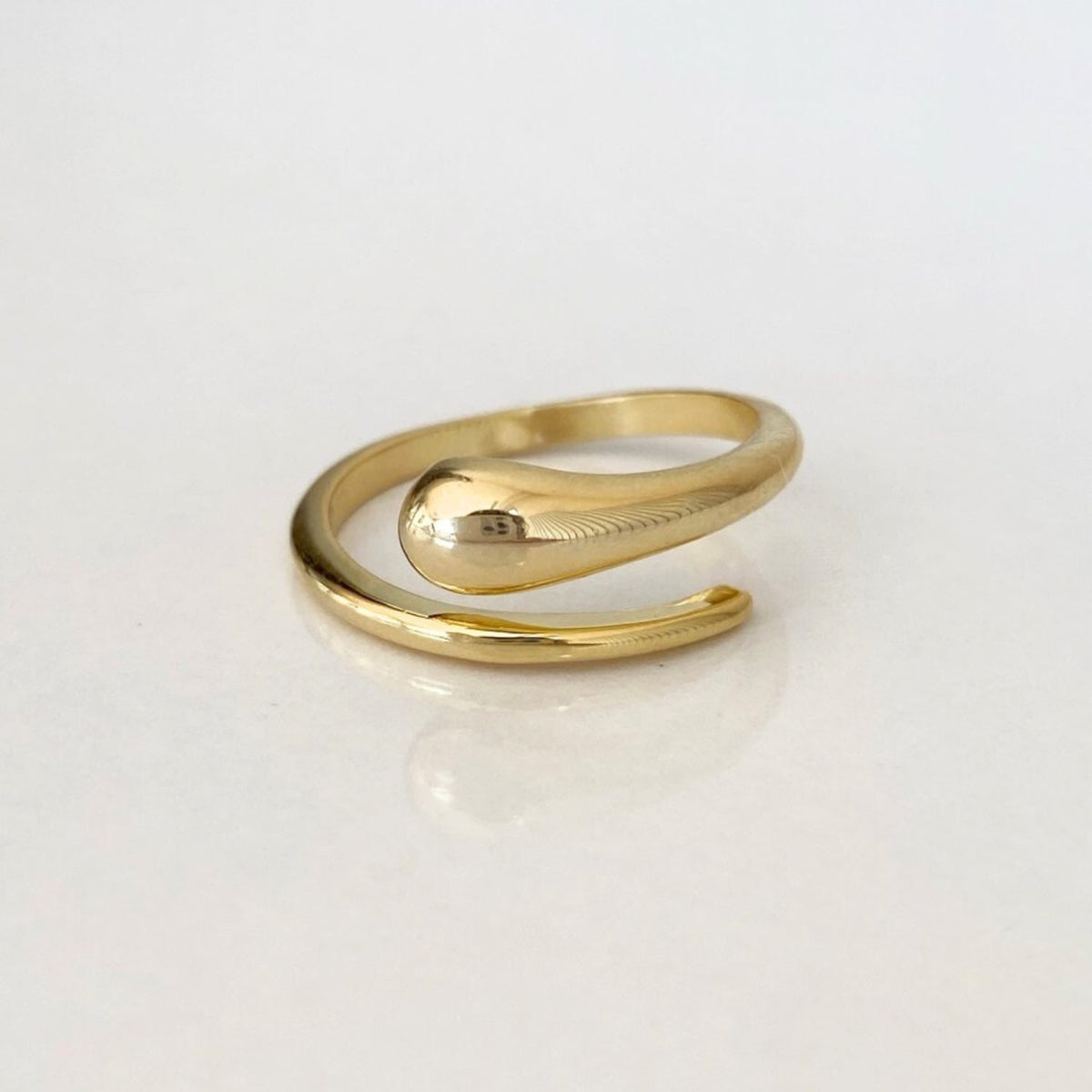 This adjustable ring is cast in 925 recycled sterling silver. It features a snake-wrap design and is available in luxe gold, rose-gold, and silver tones.