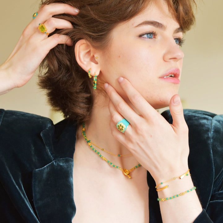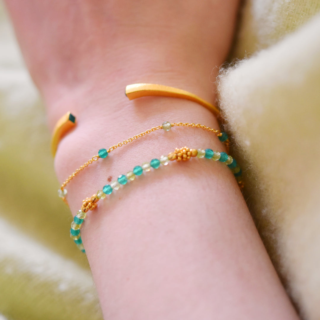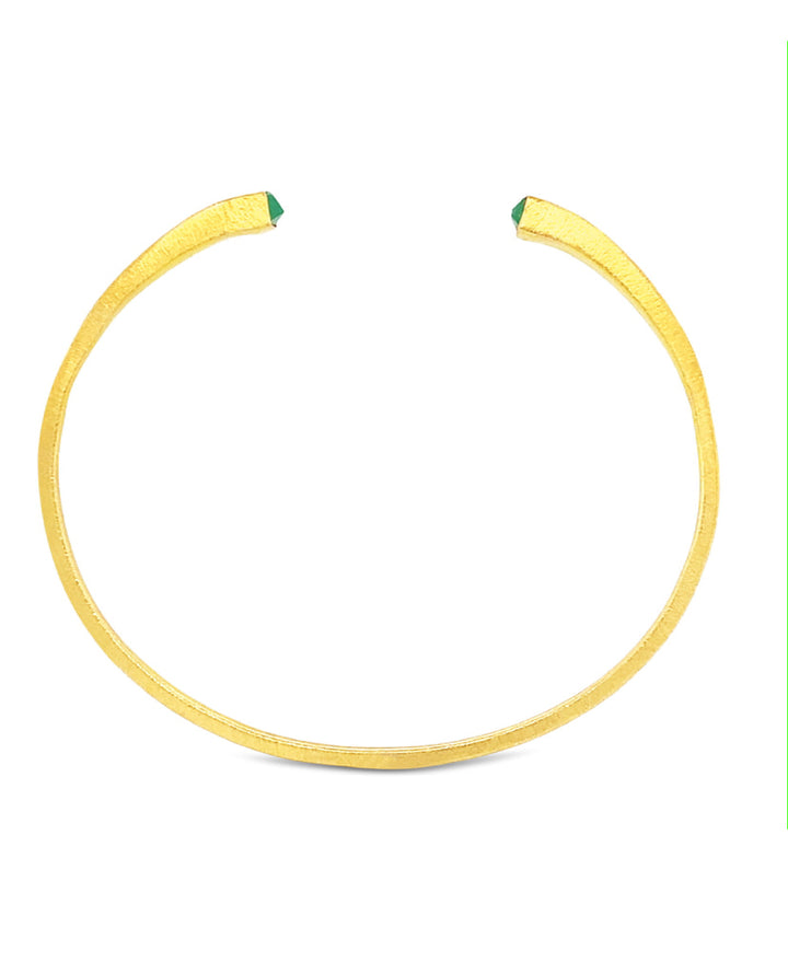 This bangle is crafted from brass with a 2.5-micron layer of 18k gold vermeil. It features a green onyx gemstone and is made with recycled metals.