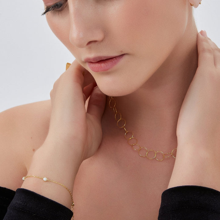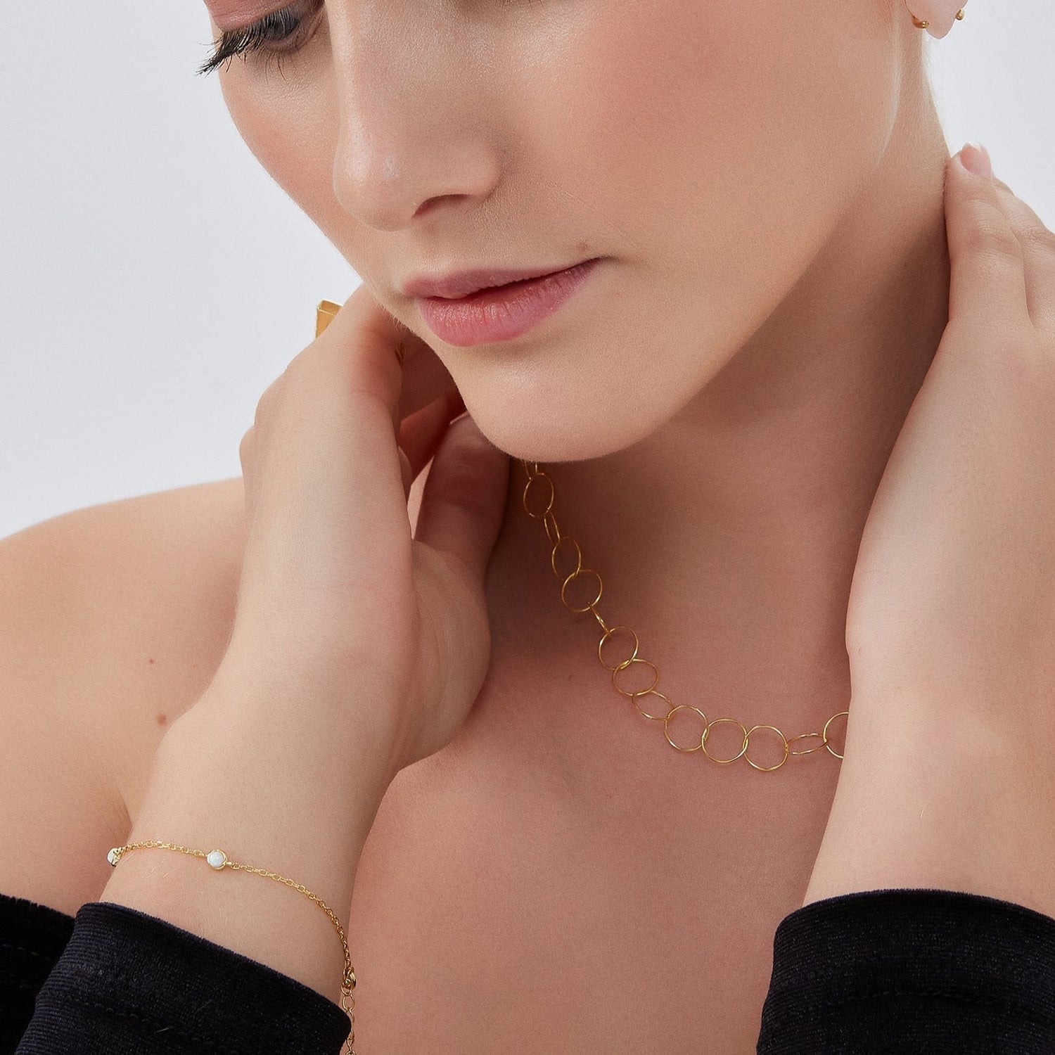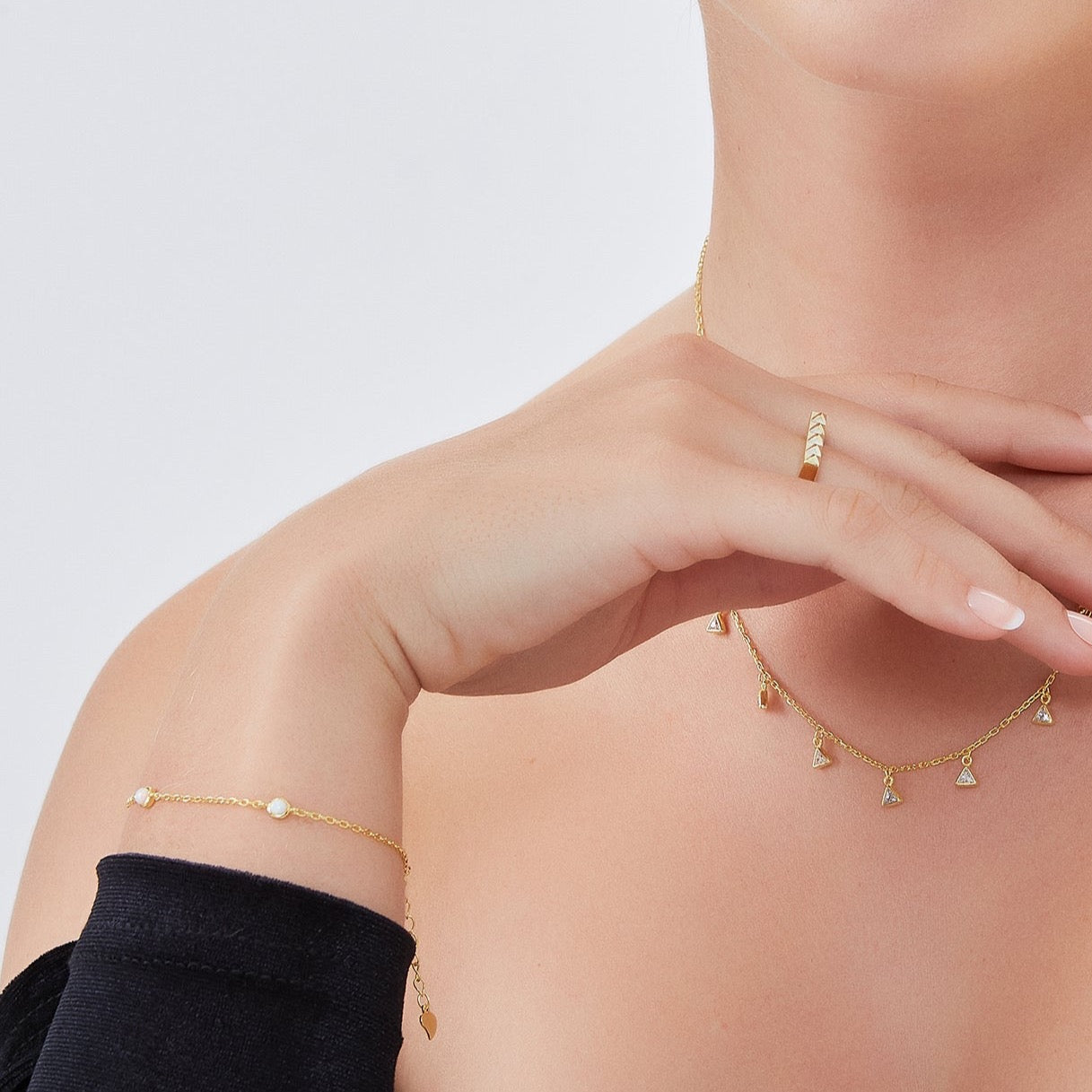 This bracelet is crafted from sterling silver with a white opal gemstone.