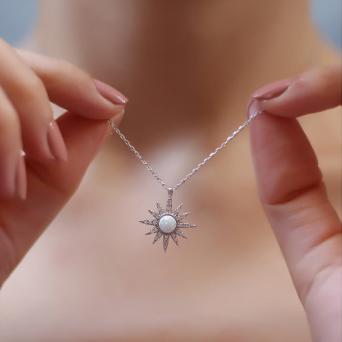 White Opal Sun Sterling Silver Necklace by Spero London is a mesmerizing and meaningful piece. The design features a sunburst motif with a gorgeous white opal stone at its center, symbolizing light and hope. Crafted from 925 recycled sterling silver, its adjustable chain and secure clasp provide a comfortable and customizable fit for any occasion. This necklace offers a touch of modern, celestial charm, perfect for adding a radiant touch to your personal style.
