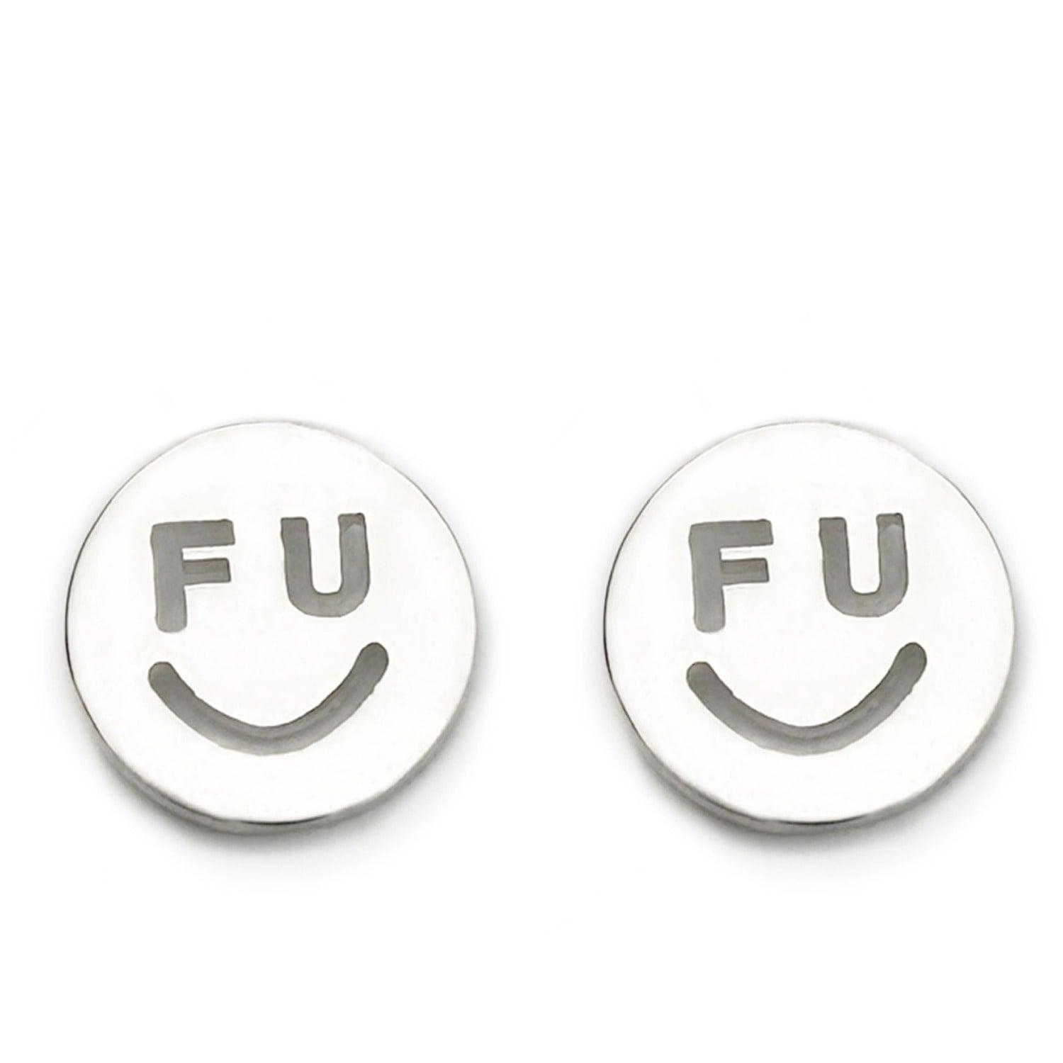 These F U Happy Face Earrings by Litzi are a unique and fun way to celebrate all of your emotions with a smile. The happy face design is a bold and playful statement that adds a touch of humor and personality to your look. These sterling silver studs are a great way to express yourself and stand out from the crowd.