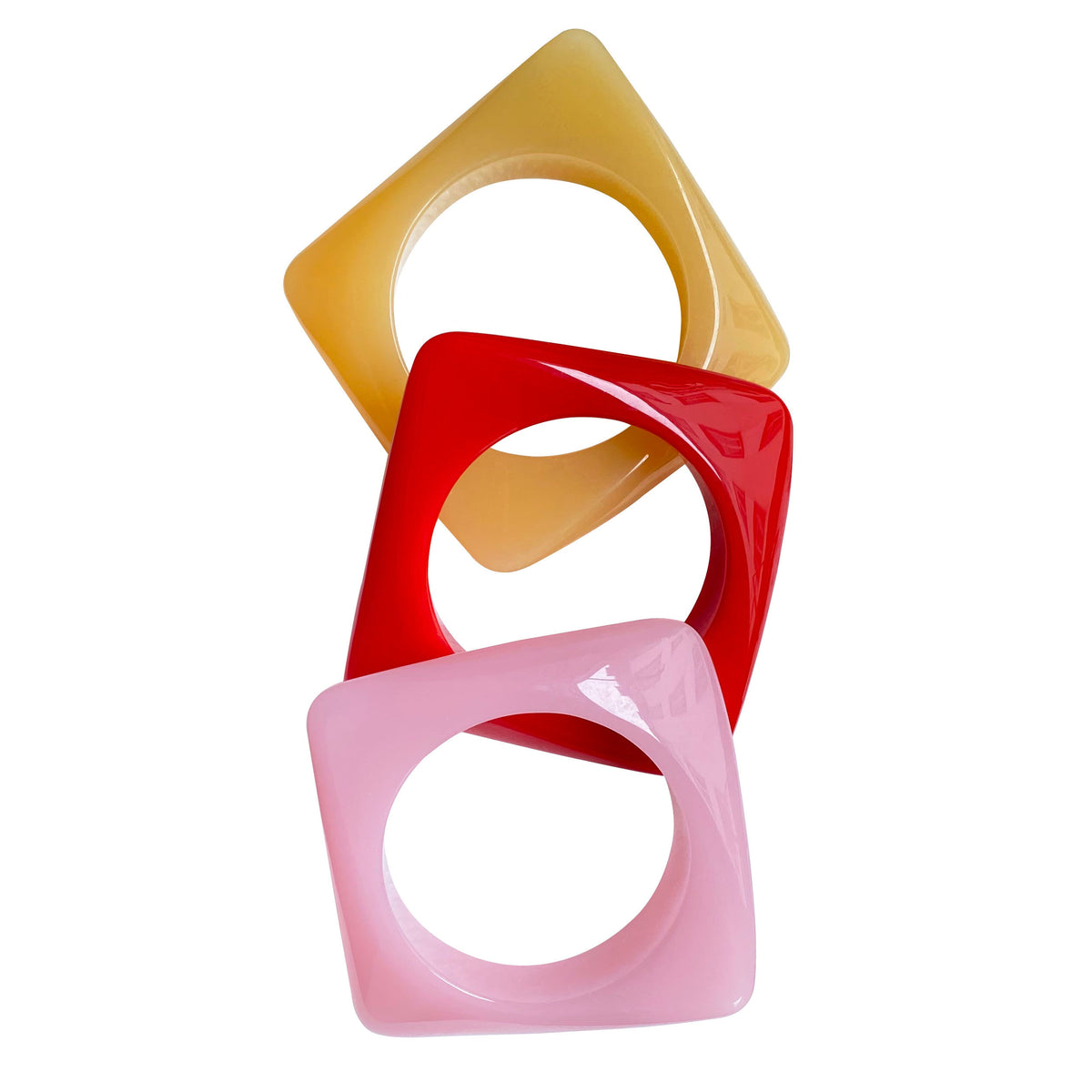 This Red Cuff Farbklecks by Smilla Brav is a bold and joyful accessory. These chunky, square bangles are made from 100% recycled plastic, giving discarded materials a second chance. Each bangle is a glossy, geometric, and unapologetically fun burst of color. Whether worn solo or stacked, this piece is designed to turn heads and spark conversations. The smooth, sculptural finish adds a pop-art vibe to any look, from casual denim to minimalist chic.