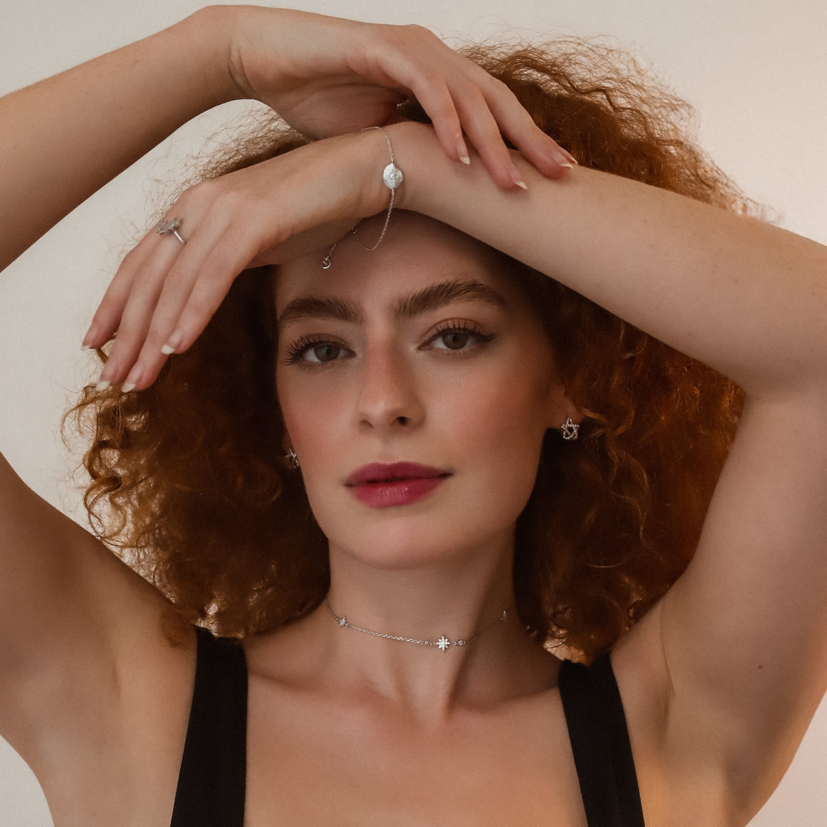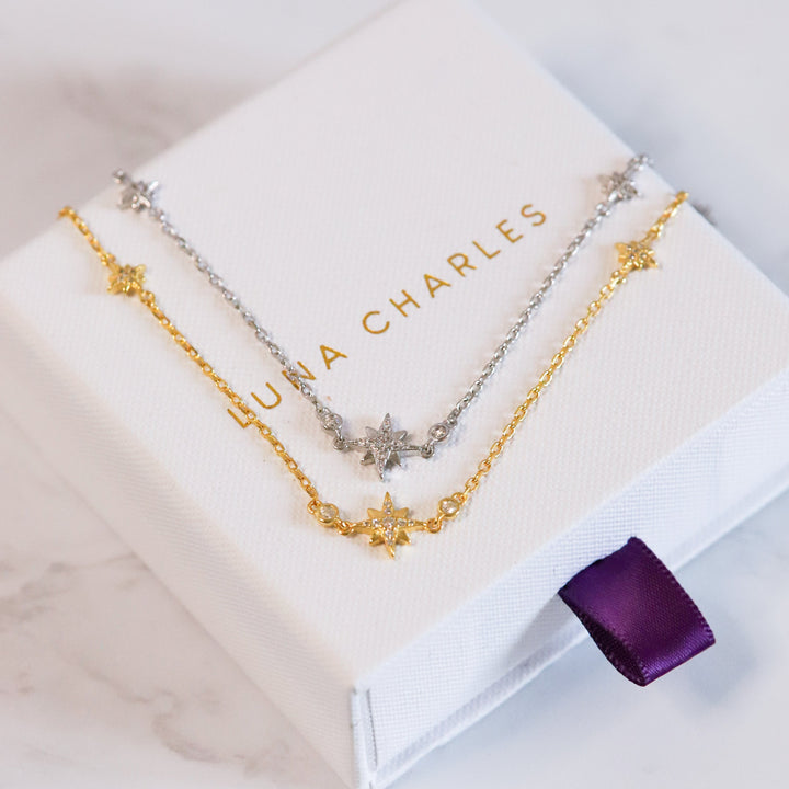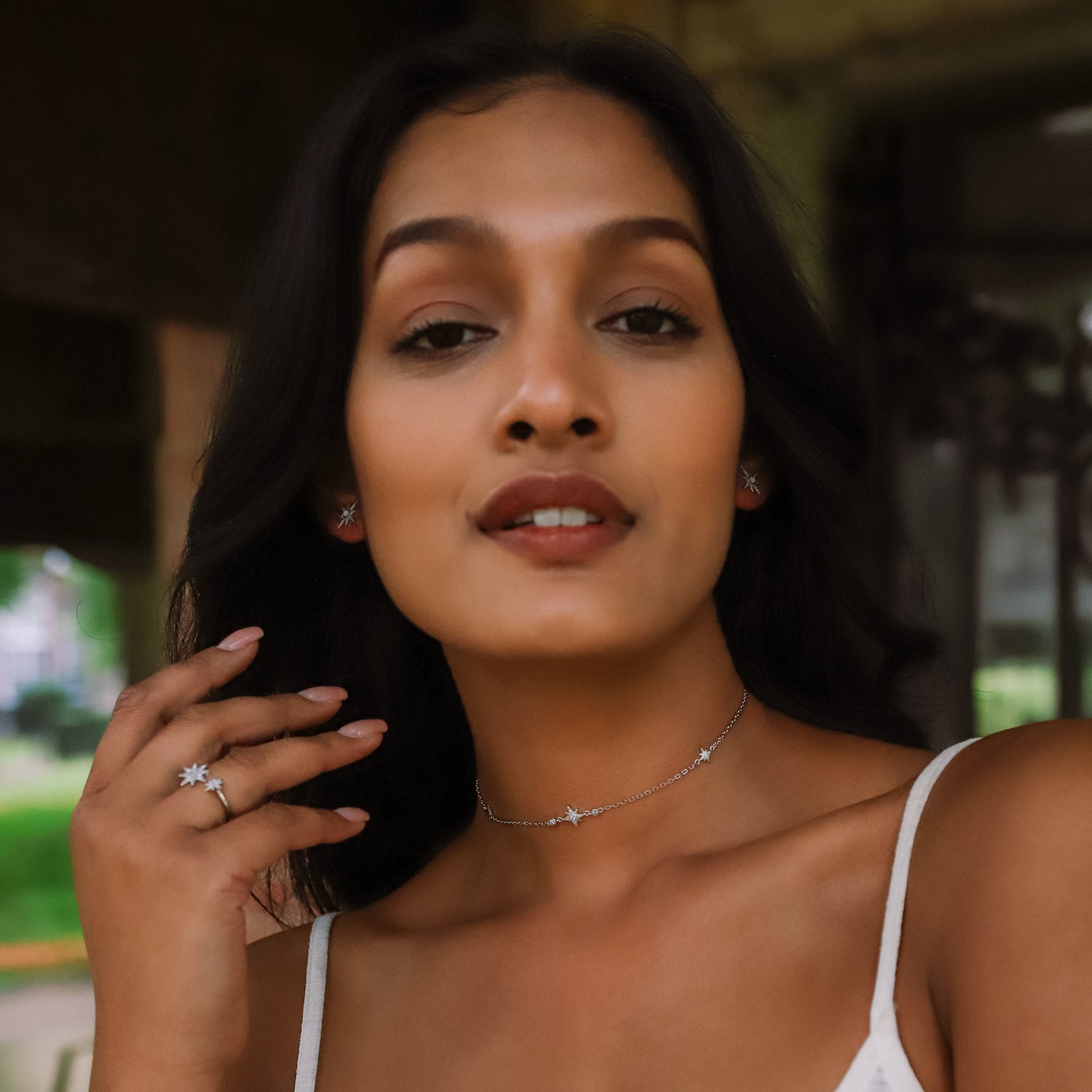 This Jenna Star Choker by Luna Charles is a simple yet stunning piece that channels the magic of a starry night. The choker is crafted from 925 sterling silver and features three sparkling stars set on a delicate chain. Two smaller stars and one larger star are adorned with brilliant cubic zirconia stones, creating an ethereal and elegant look. This versatile necklace is perfect for wearing on its own or as a base for layering.