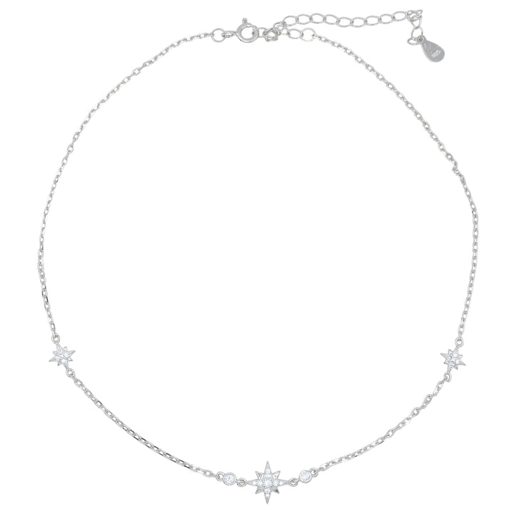 This choker is crafted from 925 sterling silver. It features three stars (one large, two small) with 5A cubic zirconia stones. The chain is 30cm long with a 7cm extender.