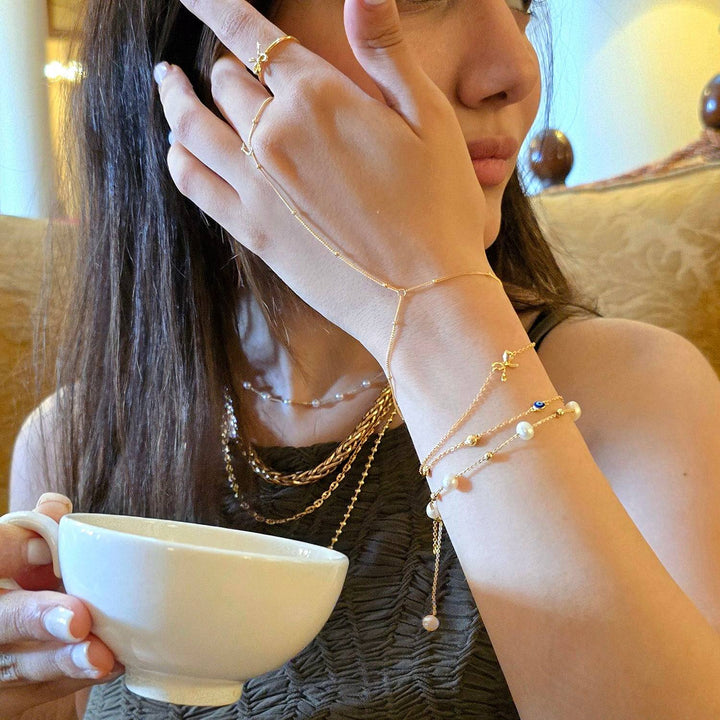 This Dainty Beaded Link Chain Gold Plated Bracelet and Ring by Harfi is a modern expression of unity and grace. The delicate beaded chain connects a slim band to a bracelet, creating a fluid piece that moves beautifully with the hand. Symbolizing harmony and connection, it makes a thoughtful bridal, symbolic, or everyday accessory. Sleek, feminine, and versatile, it is a contemporary take on elegance.
