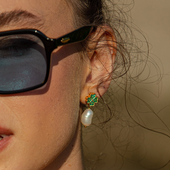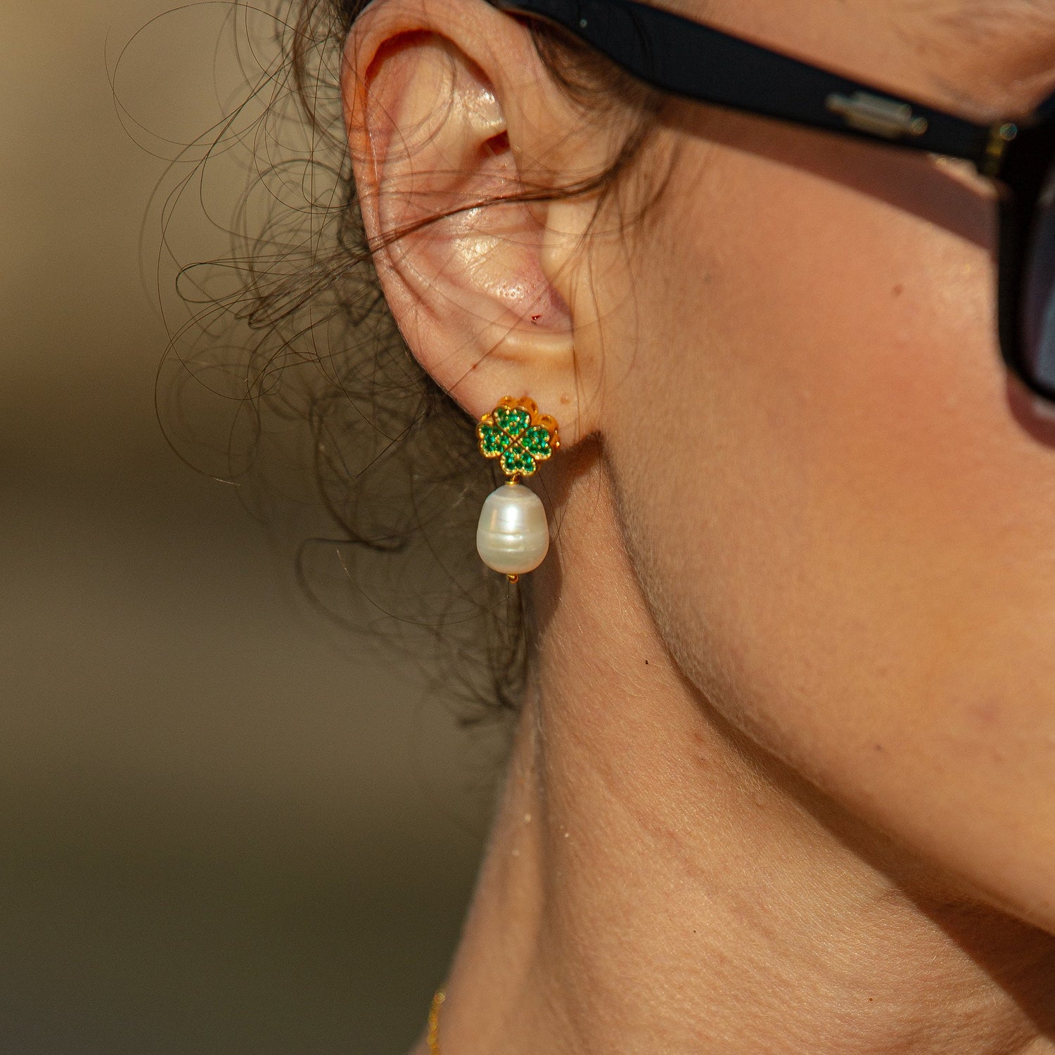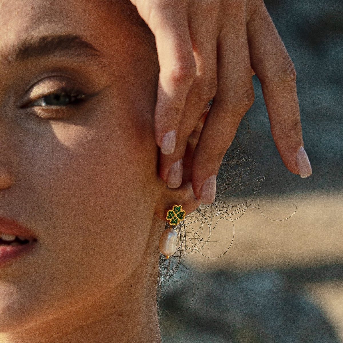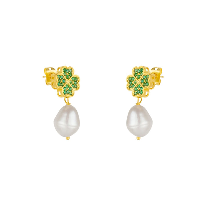 These earrings are handmade and feature a four-leaf clover stud with small green gemstones and a natural pearl drop. They are gold-plated.