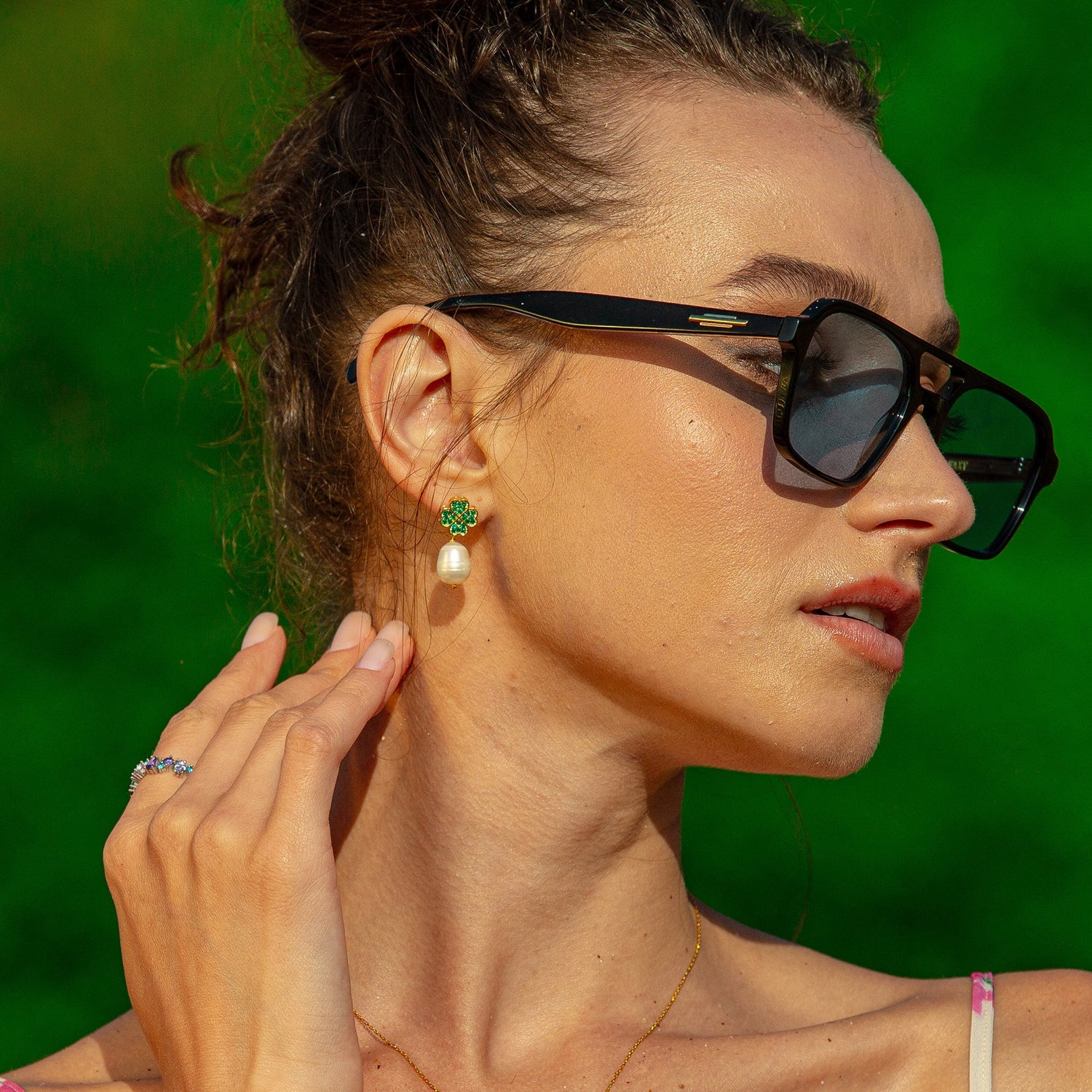 Four Leaves Clover Stud Pearl Drop Earrings In Gold With Green Gemstones