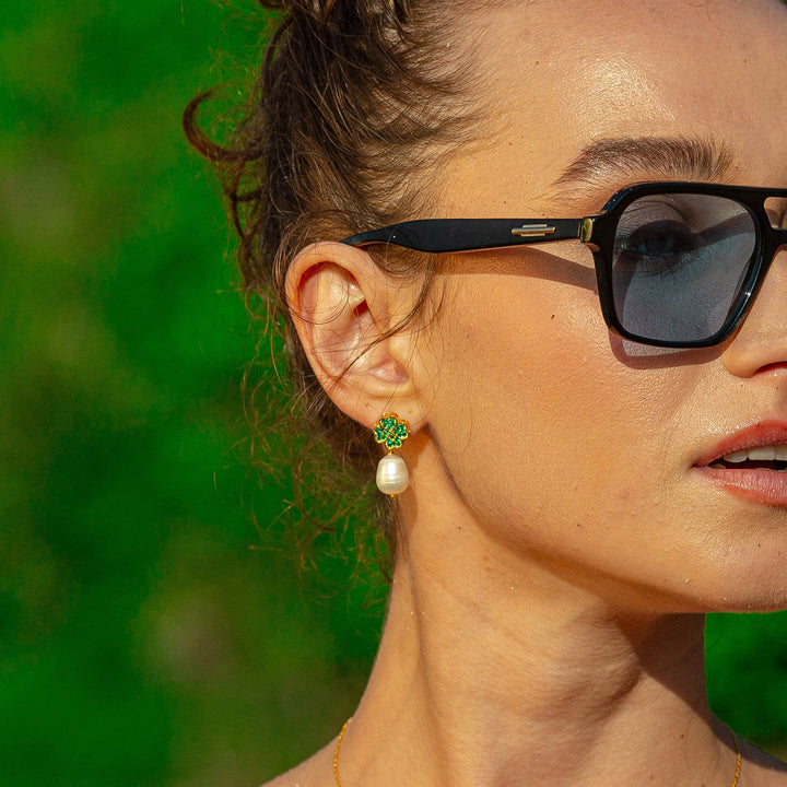 These Four Leaves Clover Stud Pearl Drop Earrings by Mejoma are a charming and beautiful accessory. Handmade by skilled craftsmen, they feature a four-leaf clover design with small green gemstones and a lustrous pearl drop. These earrings are a perfect blend of luck, elegance, and charm, celebrating the unique beauty of natural pearls with their subtle irregularities.