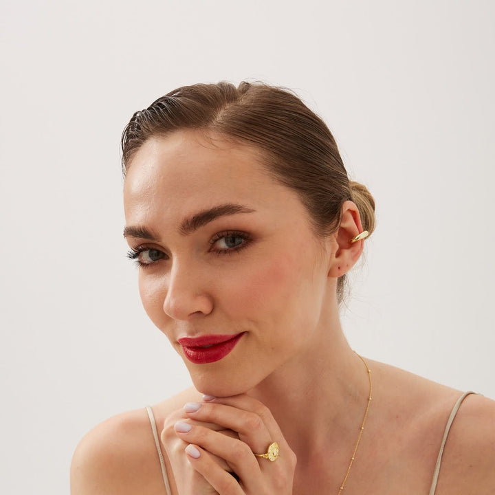 This Chunky Sterling Silver Ear Cuff No Piercing Pair - Gold by Spero London is a modern and versatile accessory that adds a touch of elegance to any ear stack without the need for a piercing. This ear cuff can be matched with a variety of outfits, from casual to formal. It can be worn on its own or paired with other ear cuffs for a dazzling, layered look. The sustainable packaging also makes it an eco-friendly choice.