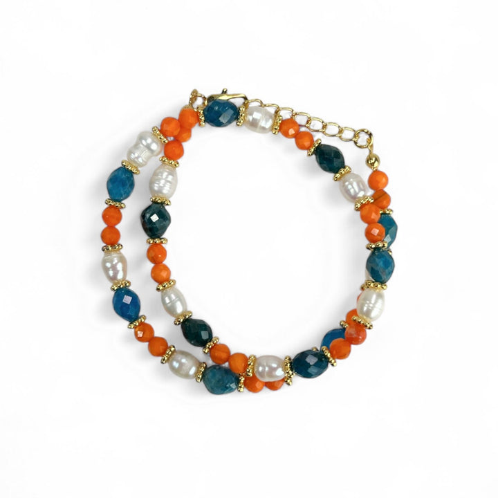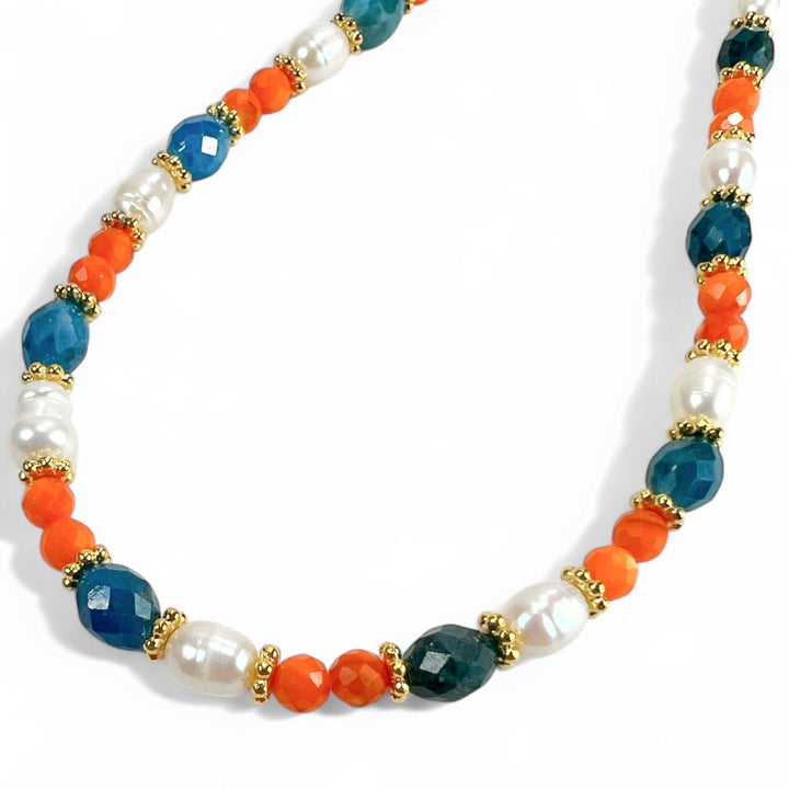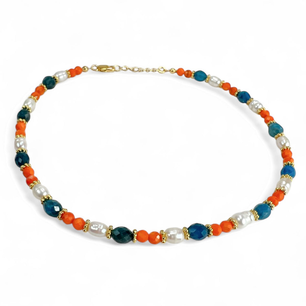 This necklace is handcrafted from natural apatite, freshwater pearls, mother of pearl, and gold-plated brass. It is approximately 40–42 cm in length.