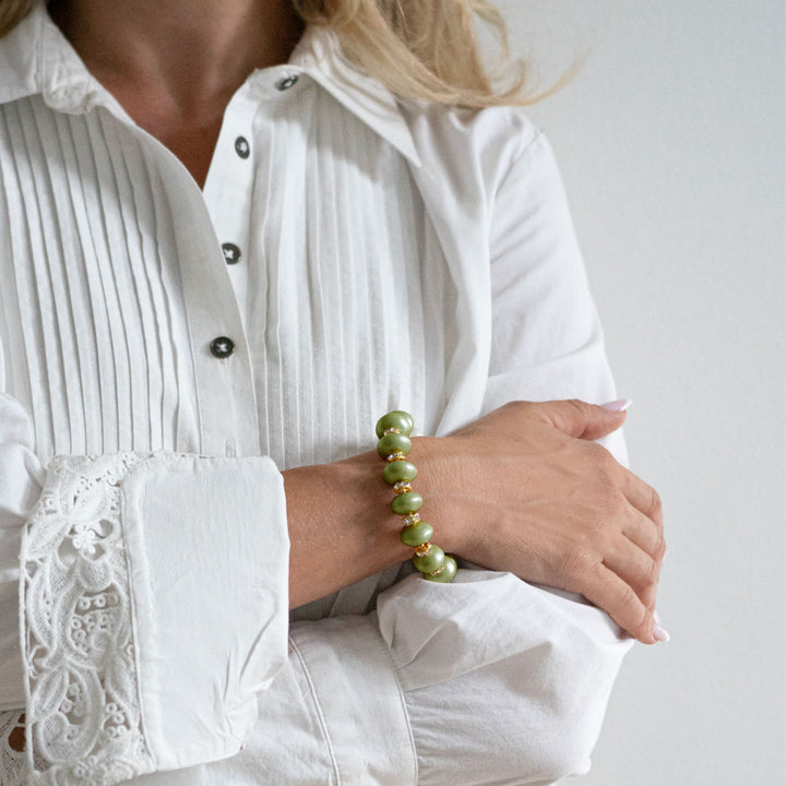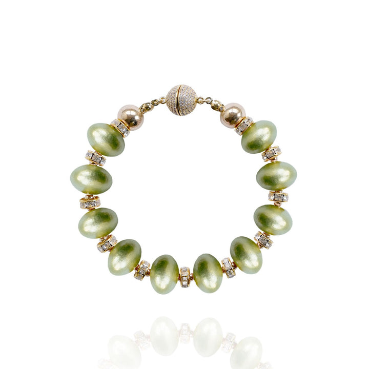 The Mika Bracelet by Saule Label in Lime Twist is a versatile and elegant piece. It features oval wooden beads interspersed with shimmering Crystal Rondelles and a magnetic clasp made of 18K gold-plated brass adorned with cubic zirconias. This handcrafted bracelet balances a delicate, hand-painted look with metallic sparkle. It is nickel-free and handmade in Detroit.