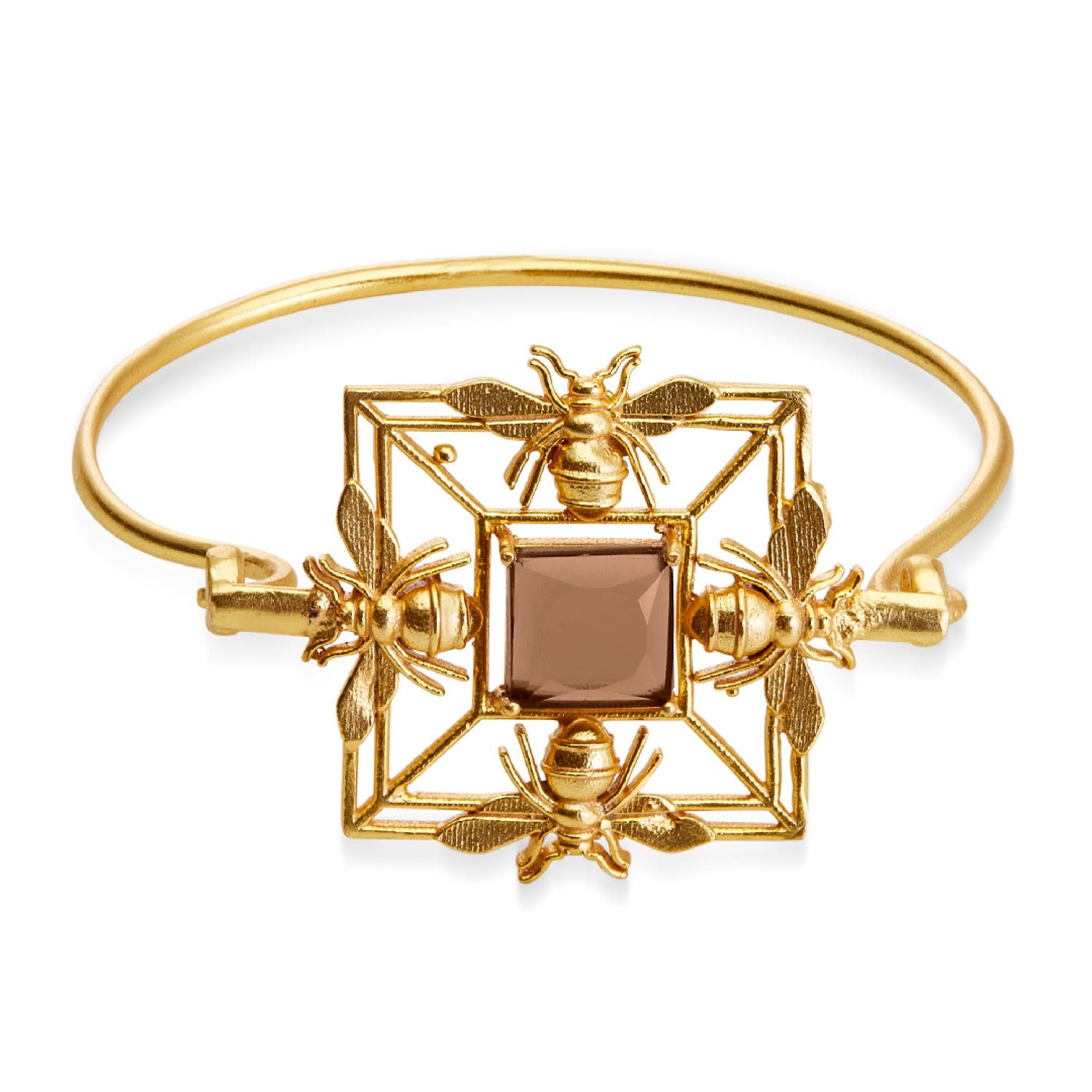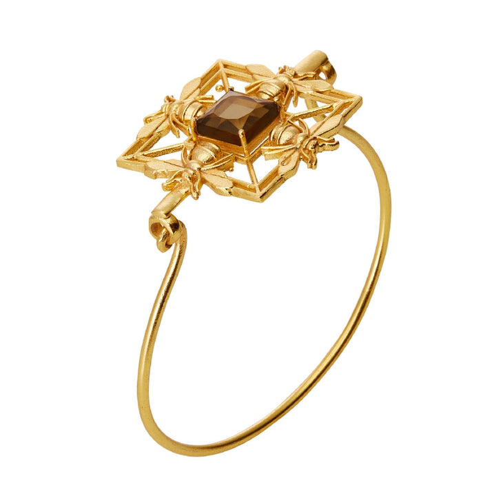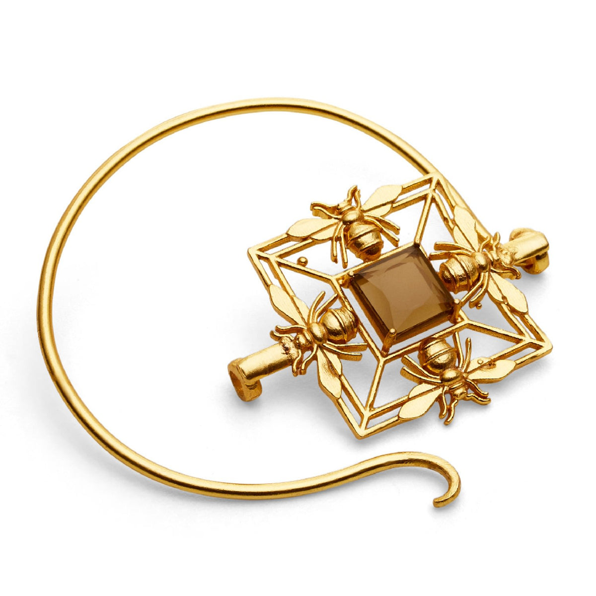 Handcrafted in brass with 22k yellow gold plating. Features bee motif detailing and square-cut quartz glass gems. Lightweight, artisanal design.