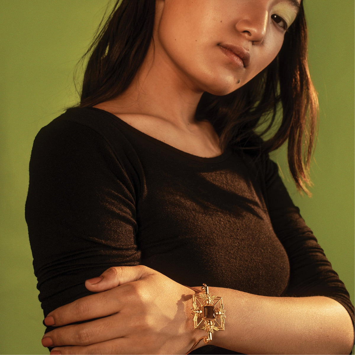 This Gold Mori Bracelet with Quartz Glass Gems by Dhwani Bansal celebrates nature and craftsmanship. Its sleek, structured form is enhanced by a delicate bee motif and square-cut quartz glass gems that shimmer with subtle elegance. A poetic and versatile bracelet that transitions effortlessly from casual to formal wear.