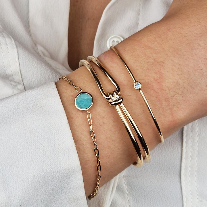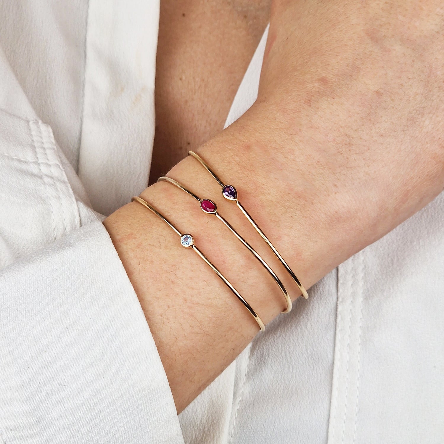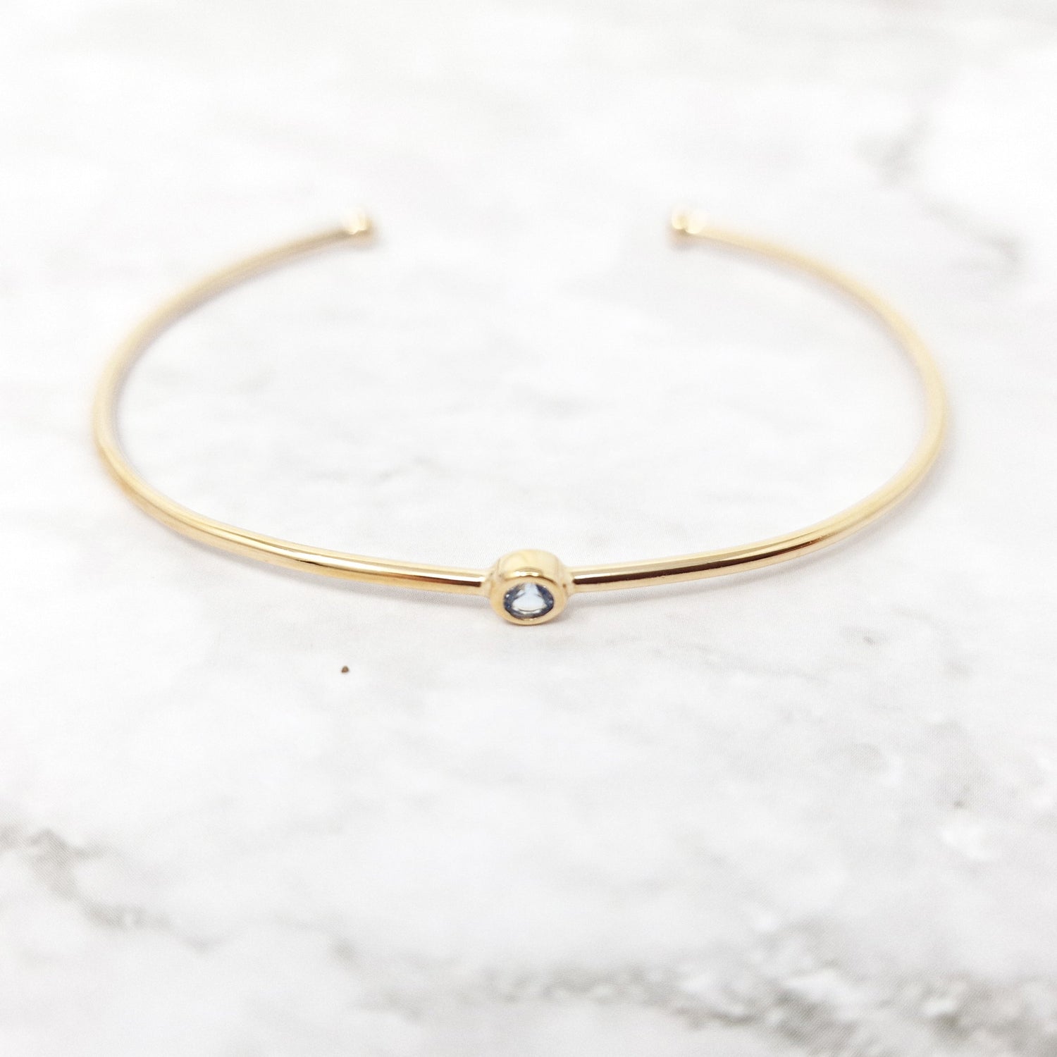 This bangle is made with 18ct gold vermeil and is accented with a blue topaz gemstone, the birthstone for December.