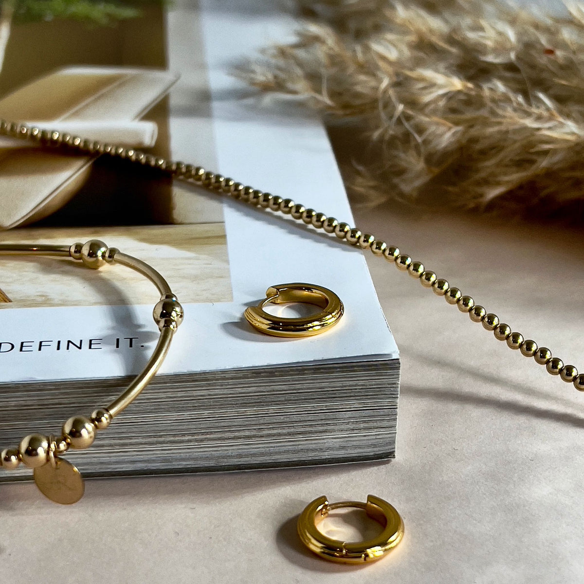 This bracelet is made with gold-filled tube beads and 5mm gold-filled ball beads on elastic cord.