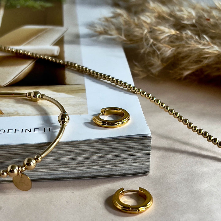 The Golden Aurora Tube & Bead Stack Bracelet by Amelia Roxanna Jewellery is a versatile and elegant piece. It is hand-threaded on durable elastic, featuring gleaming golden tubes and beads. The bracelet is made with gold-filled material, which offers the appearance of solid gold at a more affordable price. It is designed for stacking or wearing alone.