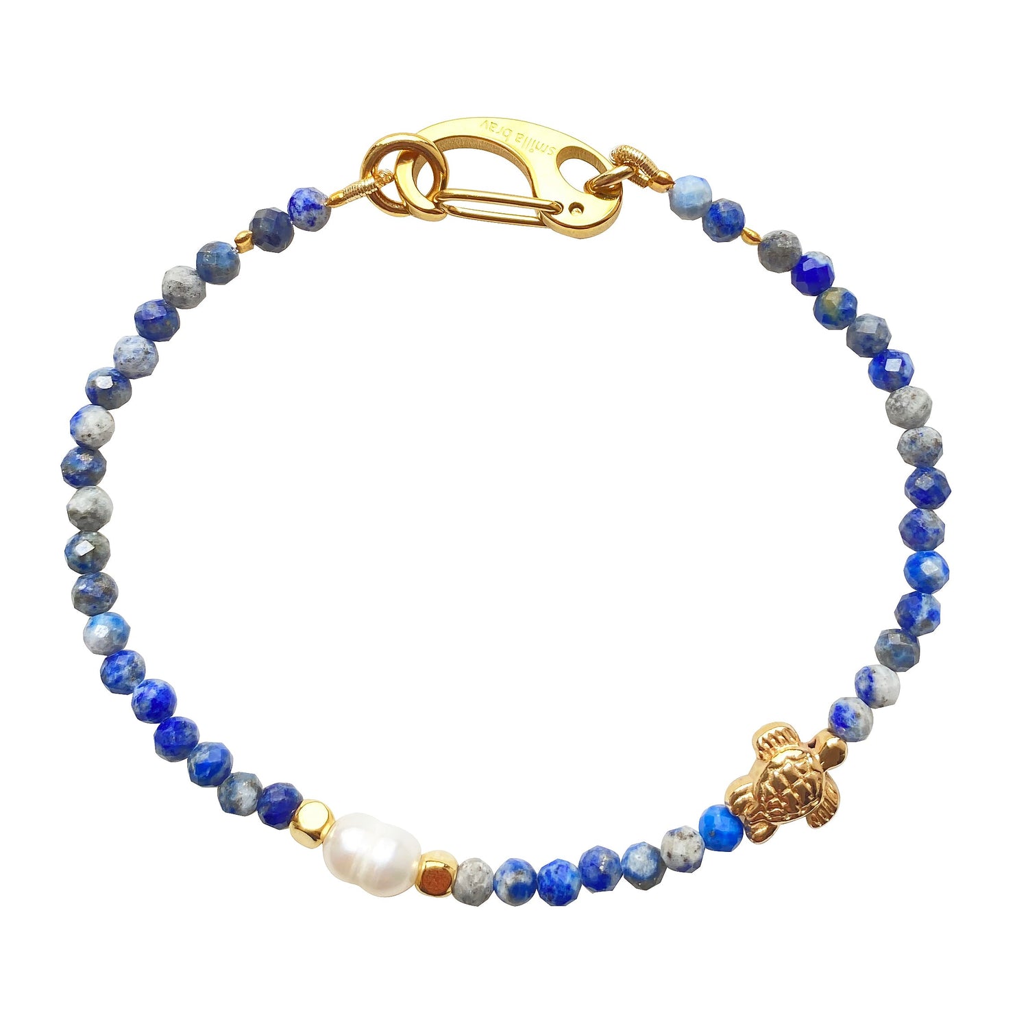 The Turtle Bracelet Ada by Smilla Brav embodies the essence of sunshine and sea breeze. This beautifully handcrafted bracelet features a harmonious mix of faceted lapis lazuli gemstones, gold-plated stainless steel elements, and a freshwater pearl. Each piece is a testament to artisanal skill and uniqueness. Its vibrant colors and playful composition make it a perfect accessory to add a touch of seaside glamour to any outfit.