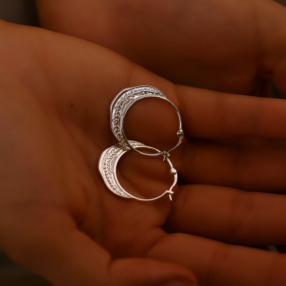 These hoop earrings are made from Sterling Silver and measure 3.00cm x 2.5cm. They have a crescent moon patterned design.